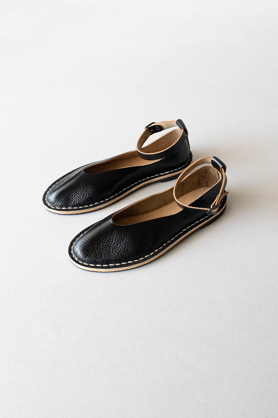 Black grained vegetable tanned calfskin pumps with a crepeline rubber sole. Handmade in Spain. Suede upper and rubber outsole. Made in Spain. True to size - but if you are in between two sizes it is recommended to size up.