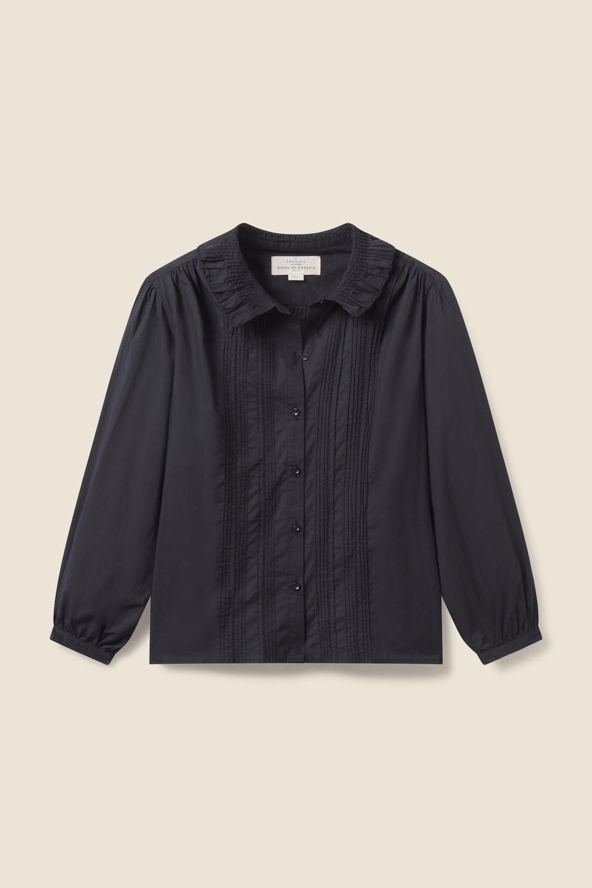 The Alise Blouse features variegated pintucking that delicately borders a front buttoned placket. Additional pintucks encircling the neck release into a gently ruffled bib collar, perfect for layering with a light sweater. 60% cotton 40% Viscose. Machine wash cold, separately. Tumble dry low, medium iron as needed