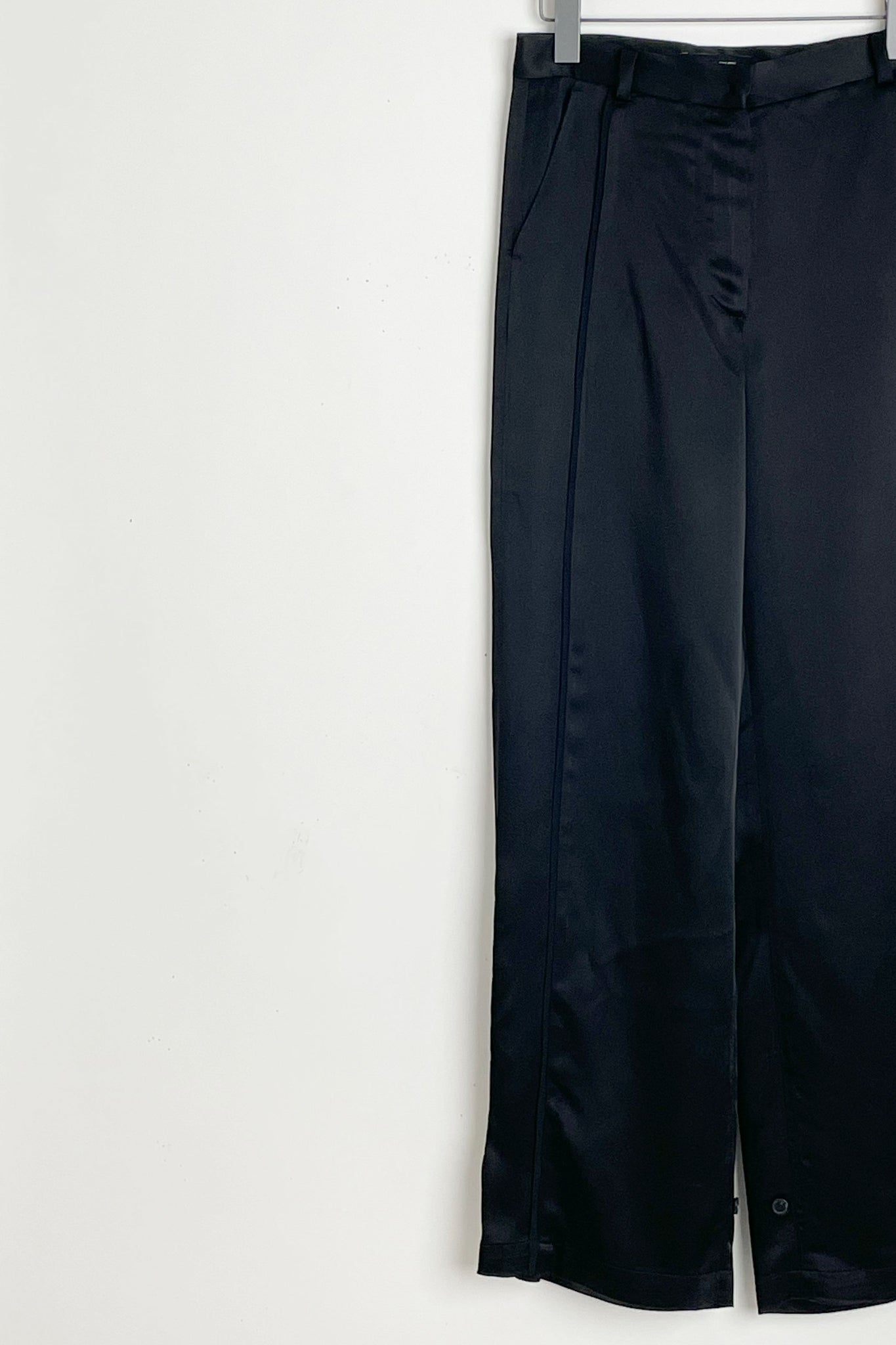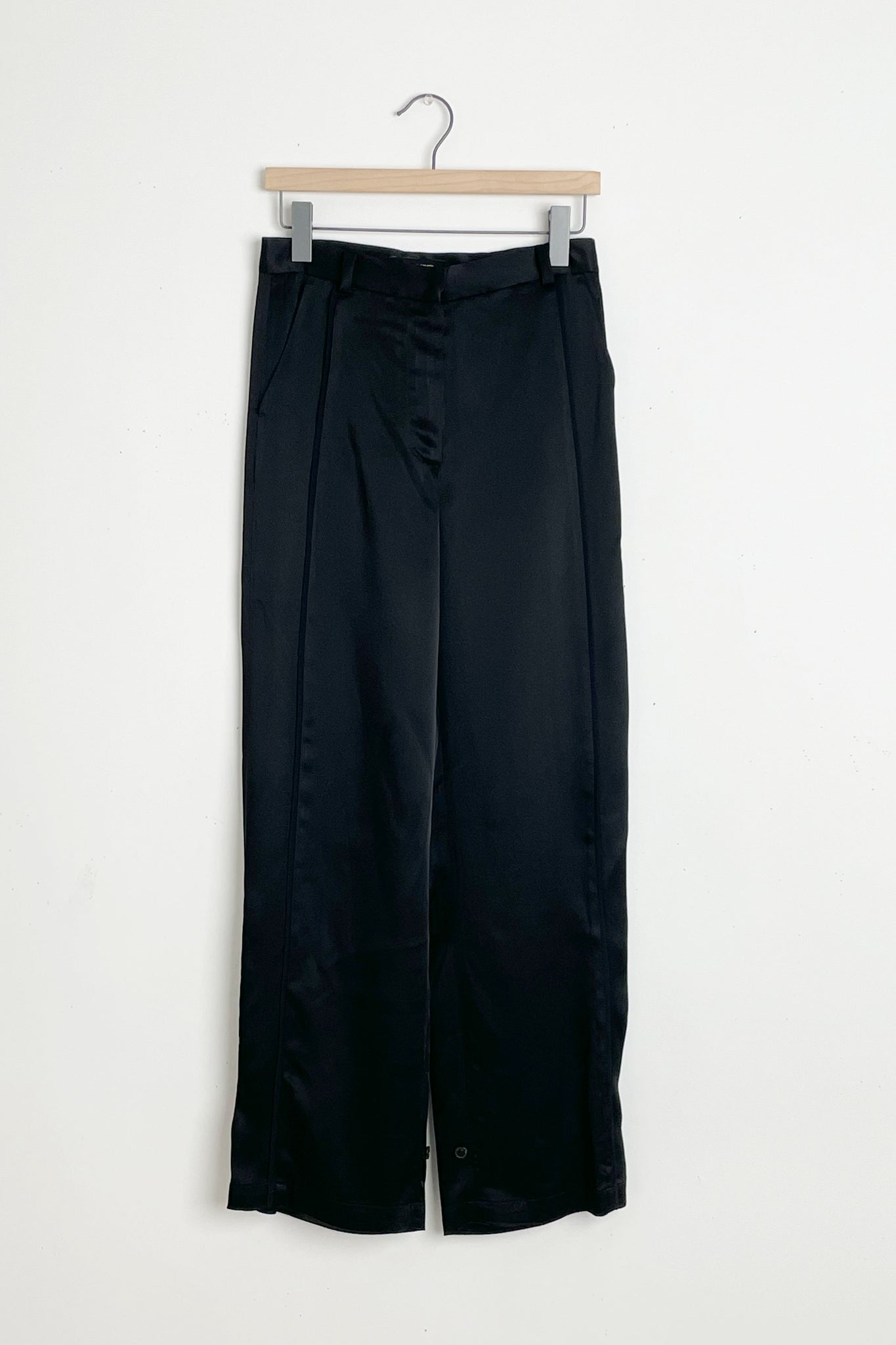 Relaxed-fit pants in a satin crepe. Designed with front seam details, a high-rise waist, and adjustable button tab detailing at the hem for a customizable shape. Features belt loops, two slant front pockets, and two rear welt pockets. 82% Acetate, 18% Viscose. Lining: 100% Viscose.