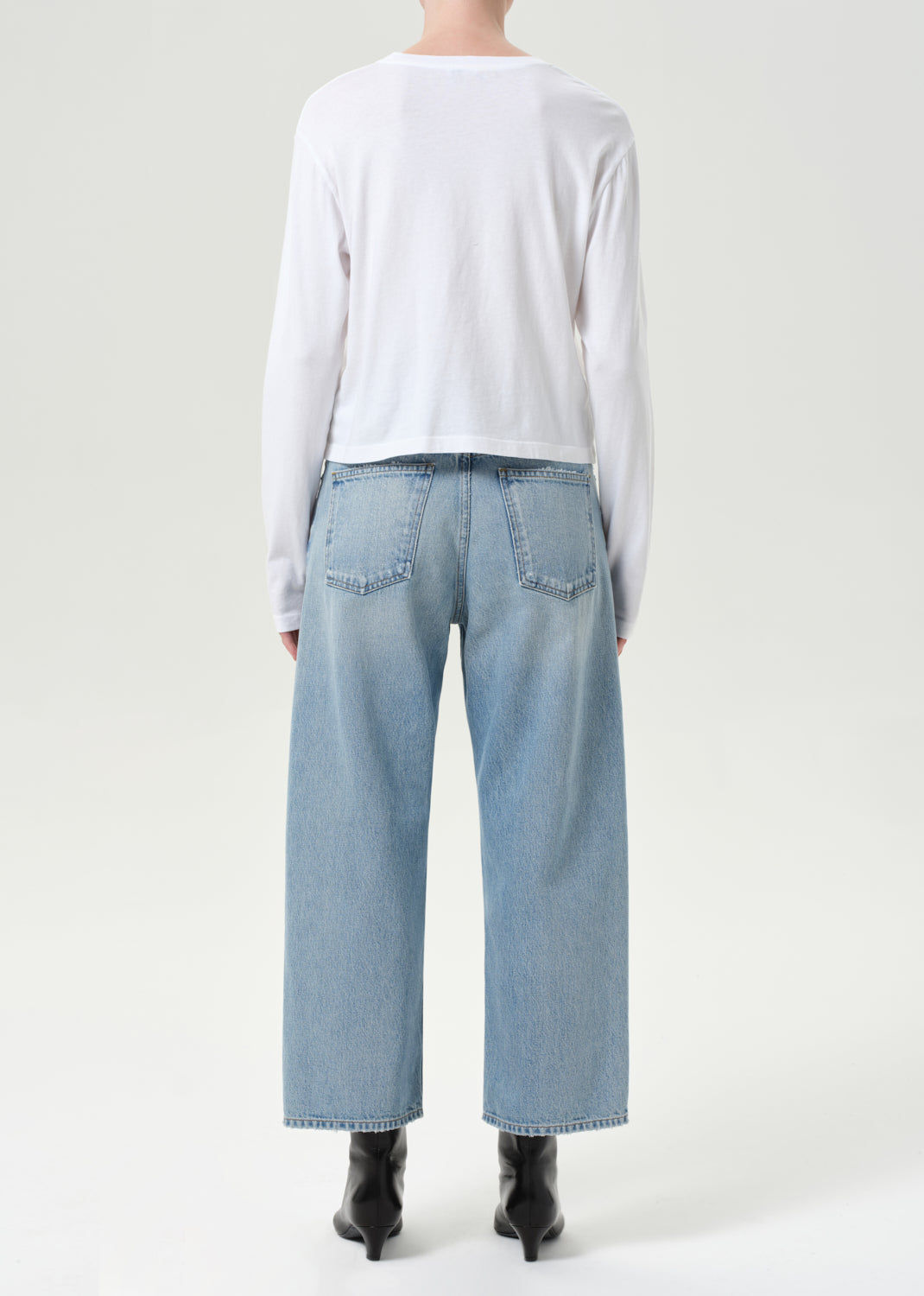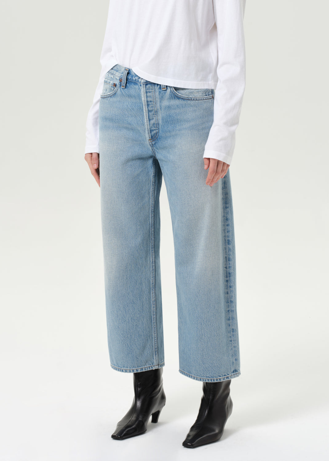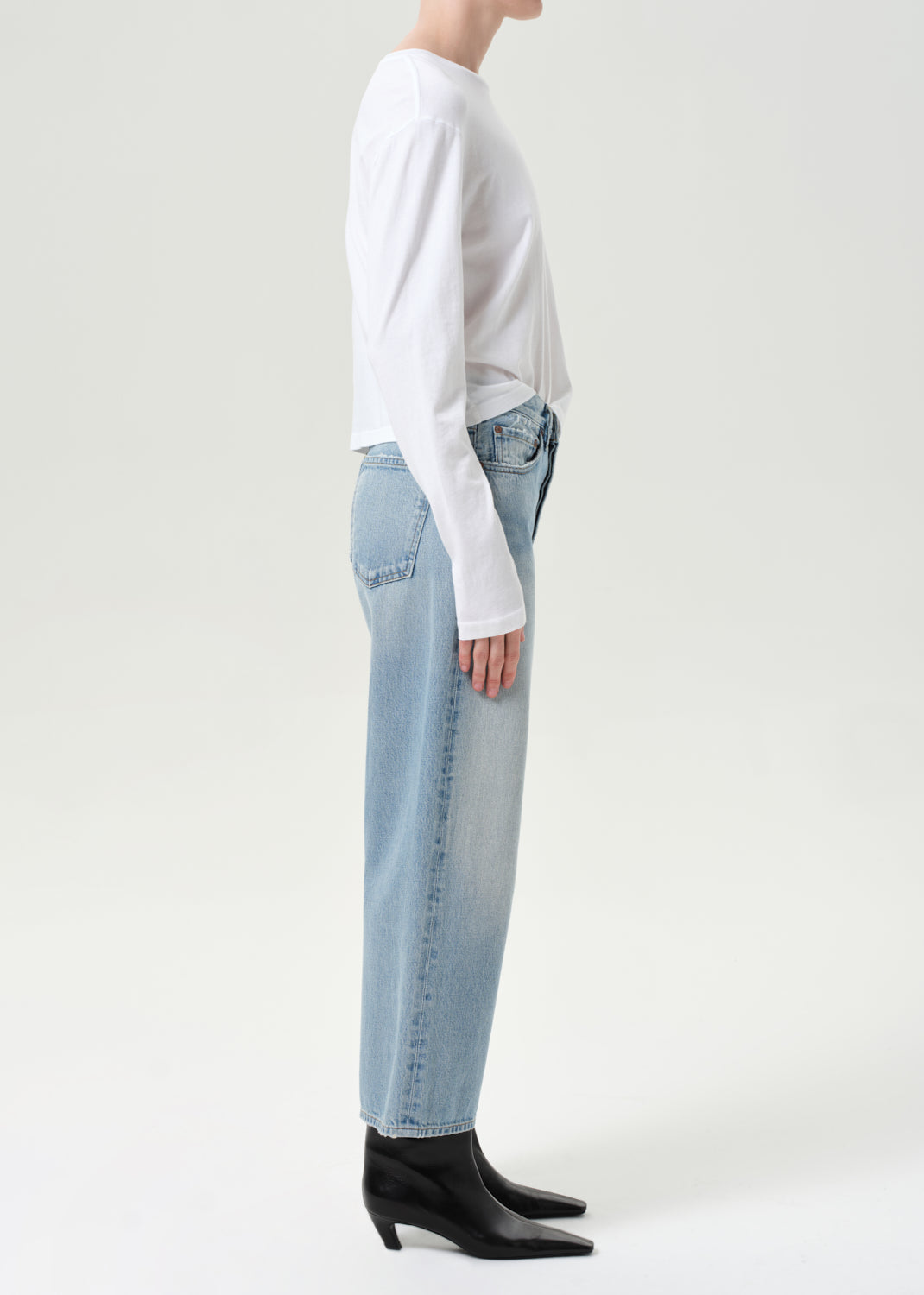 The Arc Jean features a subtle bow-leg silhouette with an easy, relaxed top block—offering a directional shape that feels effortlessly cool. Crafted from non-stretch cotton denim in a medium worn-in indigo, this fit is designed for all-day wearability with a soft hand feel. Perfectly paired with boots, the Arc is a go-to for any day and elevated layering. This fit is true to size. Looks Like: Medium worn in indigo denim pant. Feels Like: Rigid, non stretch cotton denim with a soft hand for all day wearability. Fabric: 100% Regenerative Cotton Care Instructions: Machine wash cold inside out with like colors. Do not bleach. Tumble dry low.