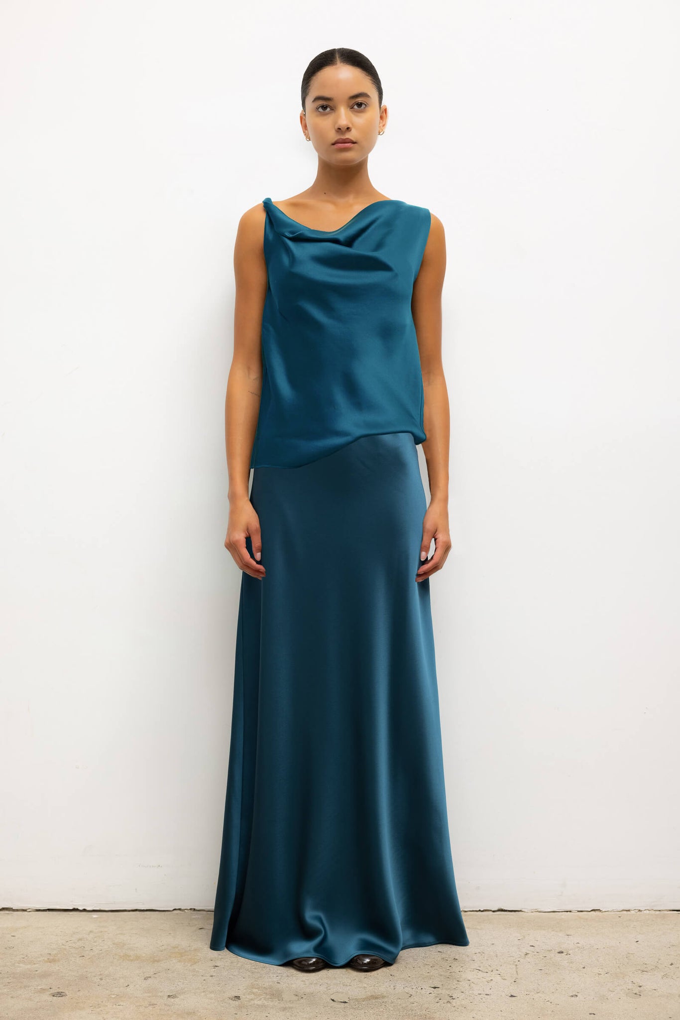 Cut in a Japanese-crafted Satin, The Barb Shell is a sleeveless top featuring twisted asymmetrical shoulders that drape perfectly. 69% Tri-Acetate, 31% Polyester. Dry clean only. Size S: 20.5" length.