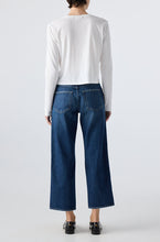 This cropped, wide straight leg is an easy fit. Cut from premium rigid denim with a mid rise, this pair is meant to sit low on the hips for a relaxed look. Thoughtful distressing throughout. Denim hem. Zip fly. 100% Cotton. Machine Wash Cold. 26.5" inseam.