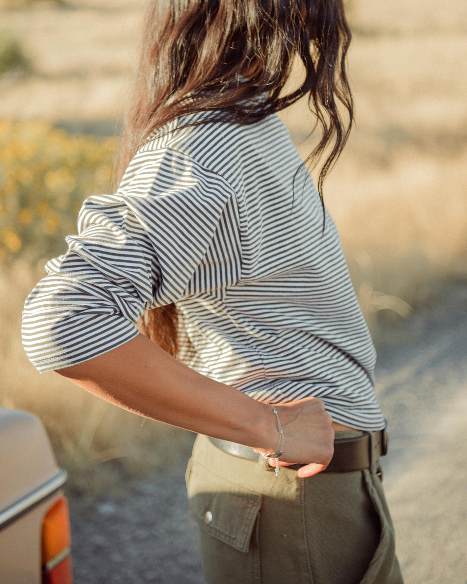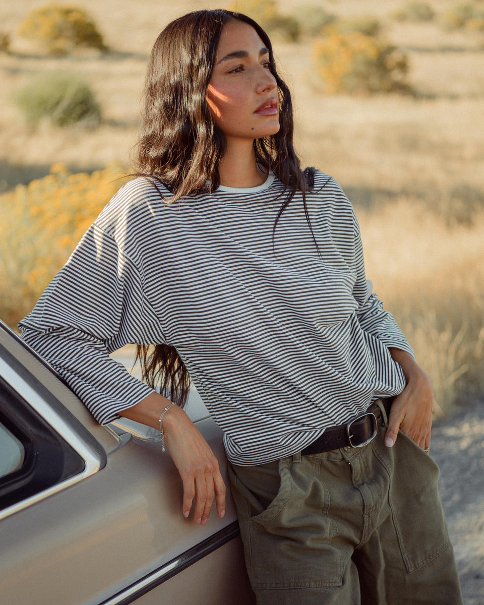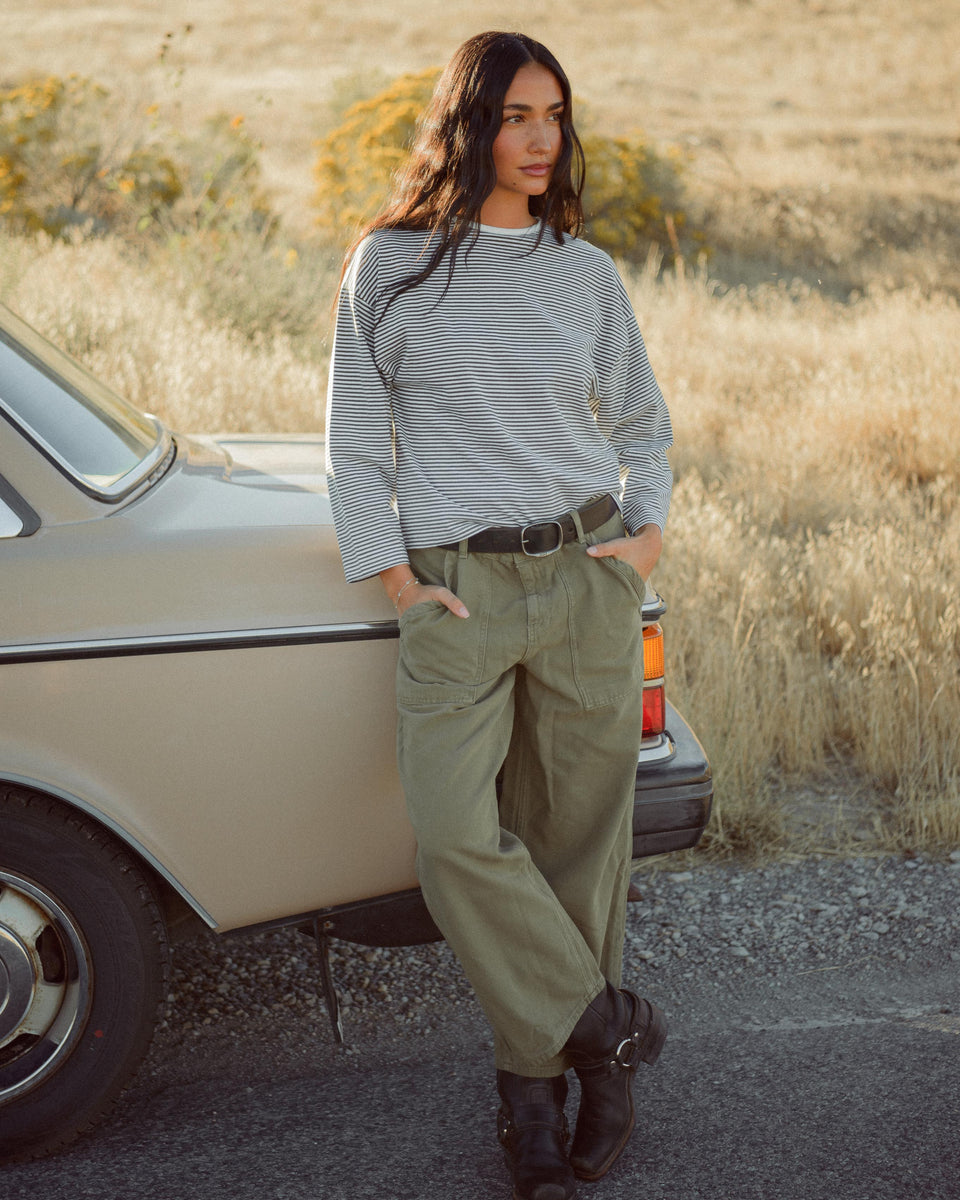 The Billie Shirt reimagines the timeless French stripe, a take on the long sleeve tee that you reach for over and over. Casual yet elevated, with the perfect amount of slouch that is sure to be a staple in your closet. Crafted from 100% cotton jersey with dark olive and white stripes, with slightly thicker fabric for more structure, designed to hit right at the waistline for a flattering silhouette.