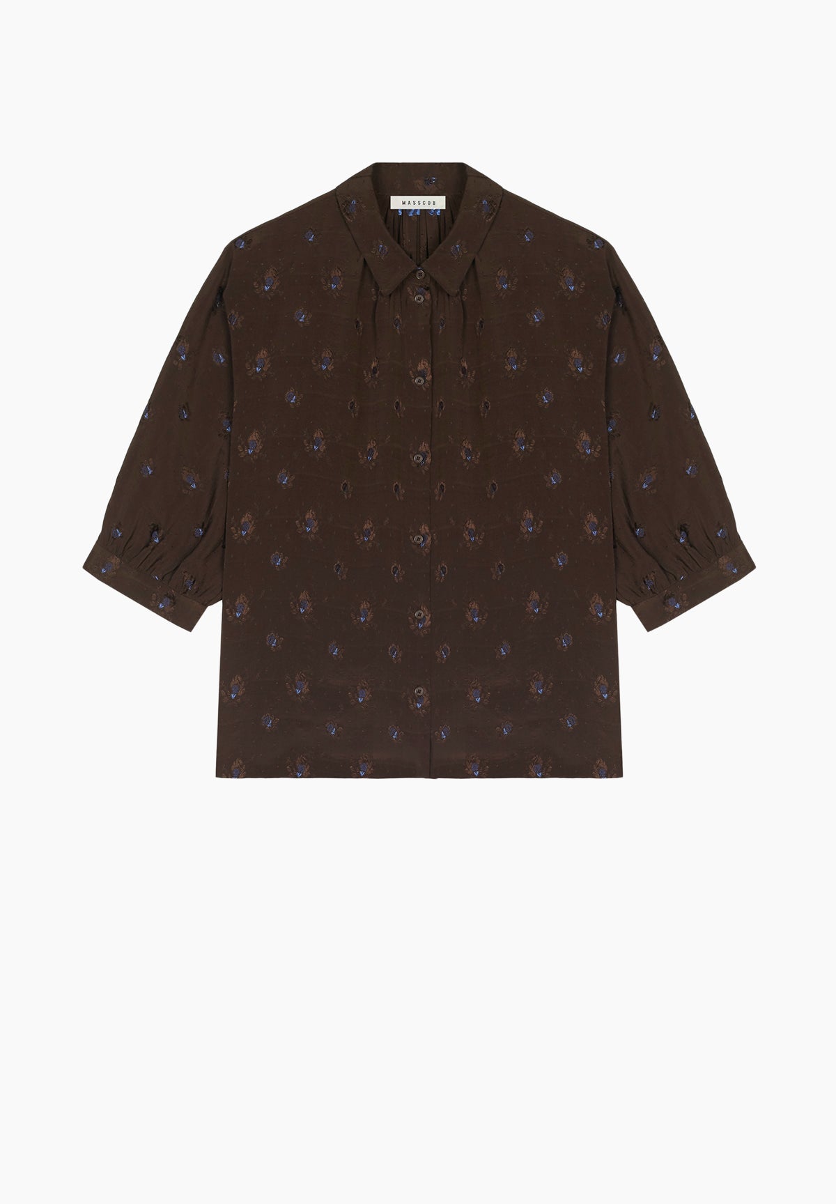 Designed and manufactured in Galicia, Spain. Lightweight fabric, embroidered with a contrasting floral detail. Regular fit, standard length. Composition 64% Silk 36% Viscose Color Brown with navy blue embroidered detail. Final Sale
