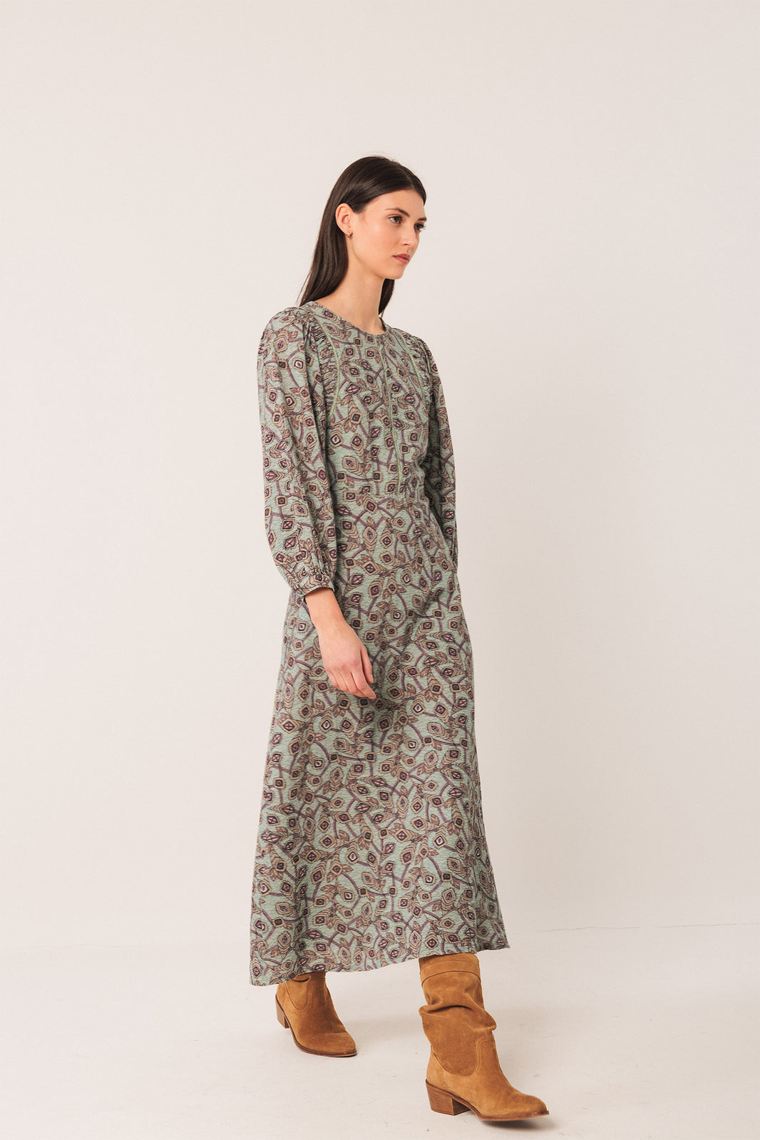 A dress with fitted shoulders and pleated details around the armhole, with a lace trim. The balloon sleeves add movement and volume, and its digital-print crepe cotton gauze fabric provides a boho look. Fitted shoulder with pleated detail on armholes, plus a lace insert. Teardrop and button closure at back and balloon sleeves with cuffs. Waist cut and evasé skirt. Crepe cotton gauze fabric and batik-inspired digital print. Slim fit: Designed for a close fit