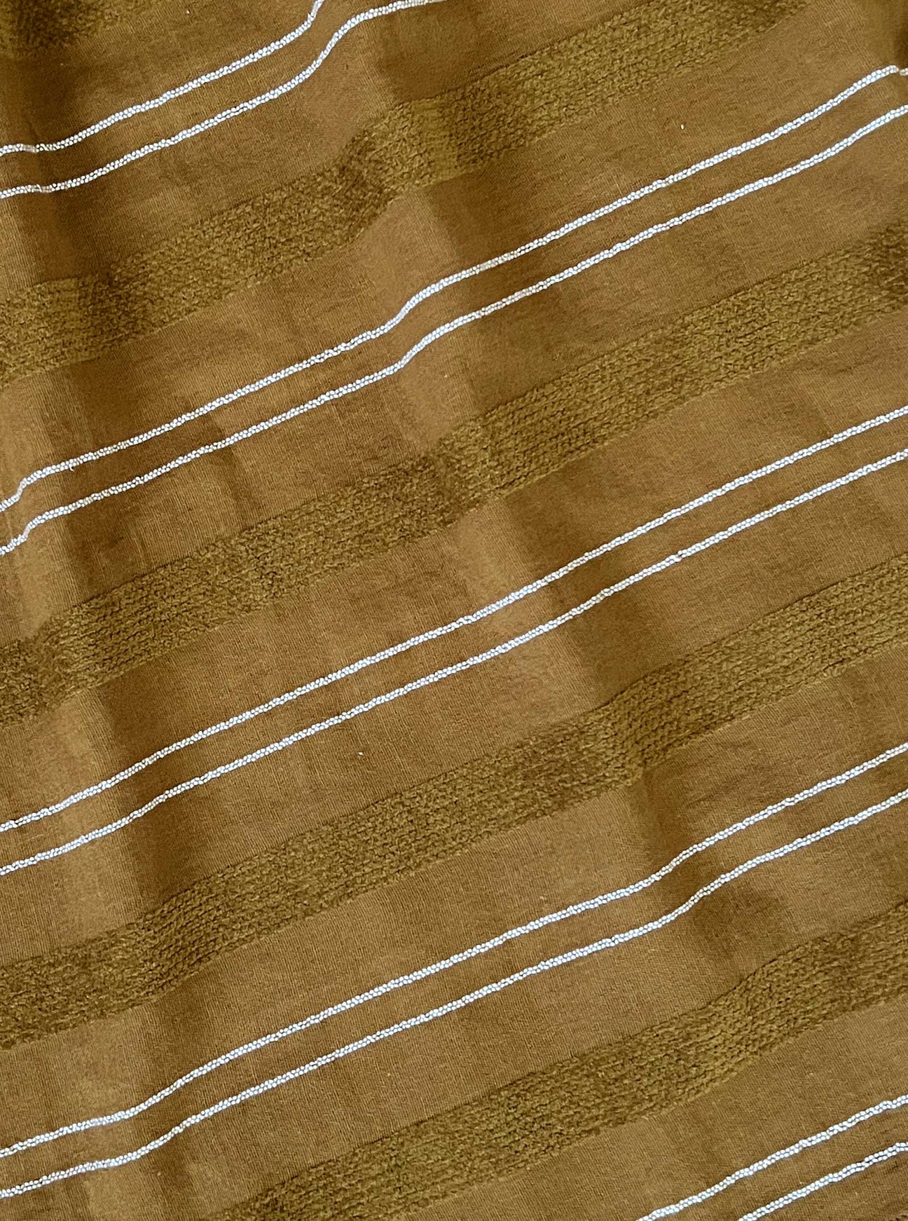 An essential button front blouse with raglan sleeves and a slightly gathered neckline. made in a rattan textile, a lightweight gauzy olive brown singlecloth with luxe woven chenille-like textures and thin cream stripes. 100% organic cotton. Hand wash cold or dry clean, dry flat. Size S: 25" length. Final Sale