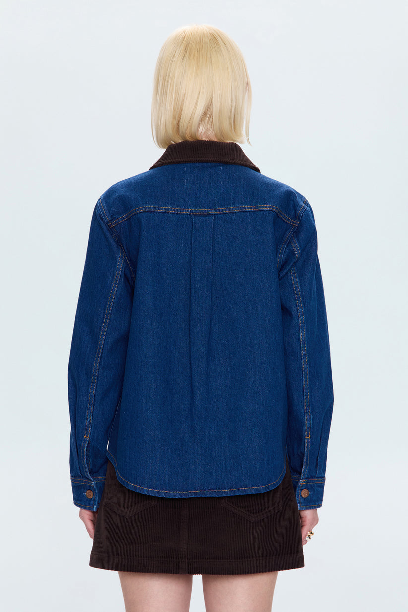 The layering piece you didn't know you needed. Devon delivers the perfect balance of shirt and jacket with a relaxed fit that feels effortlessly cool and never oversized. The classic button-up styling with a contrast brown corduroy collar brings utilitarian appeal while the comfortable proportions make it perfect for layering or wearing solo. 100% Cotton. Size S: 26" length. Machine wash cold, line dry.