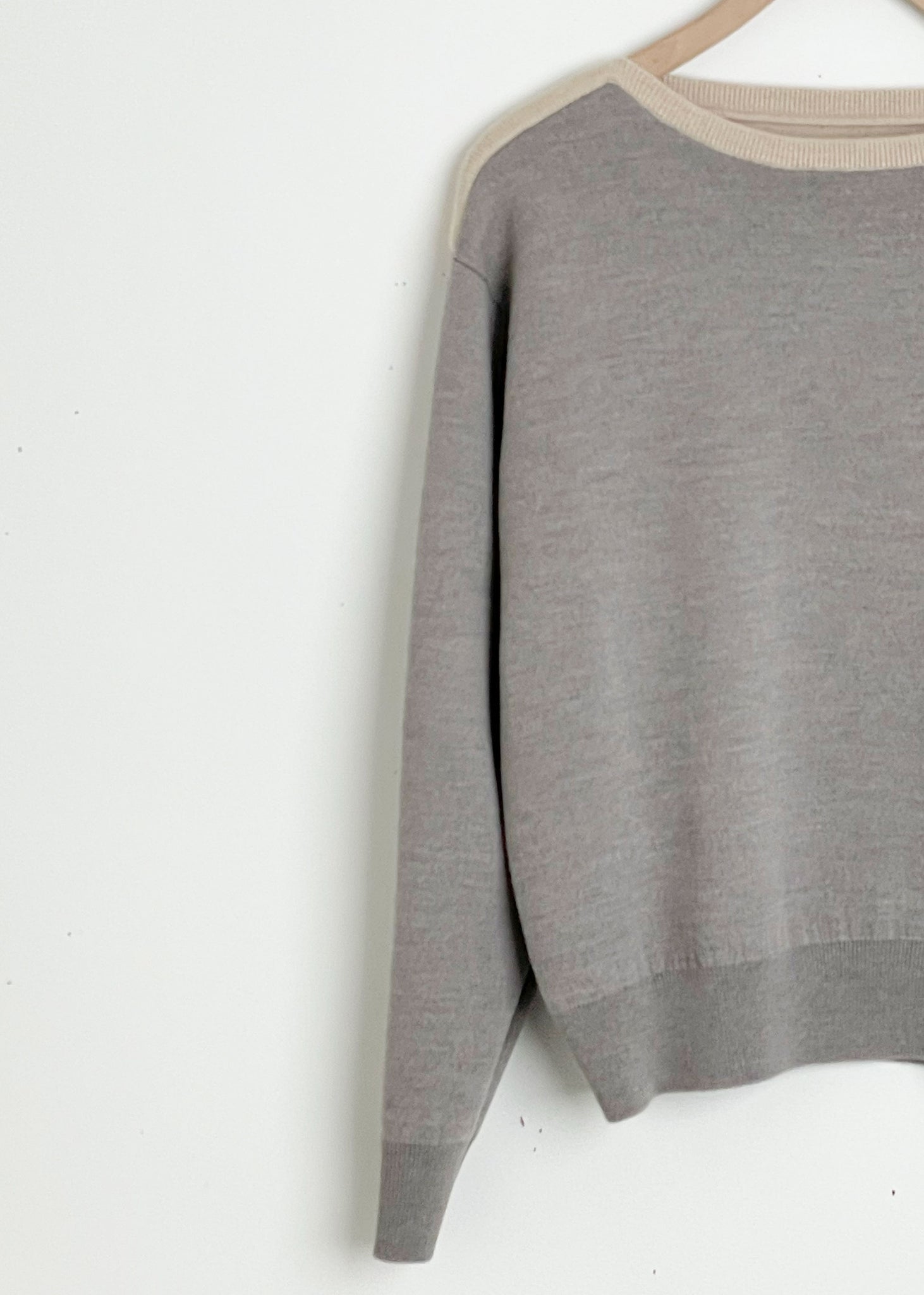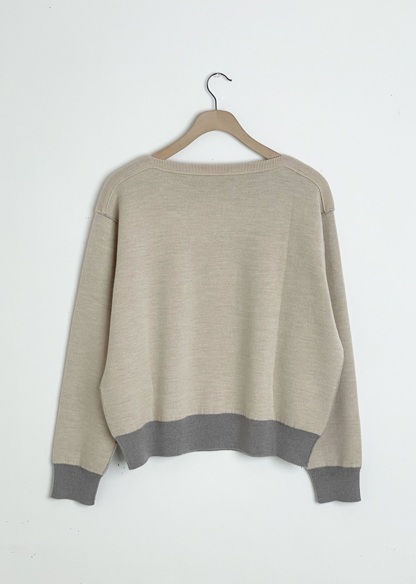 Finely knit wool reversible sweatshirt with contrast stitching and hem. On the reverse side, there is no exposed contrast stitching, but a contrast collar and shoulder details. Relaxed boxy fit. 100% Wool, dry clean only.