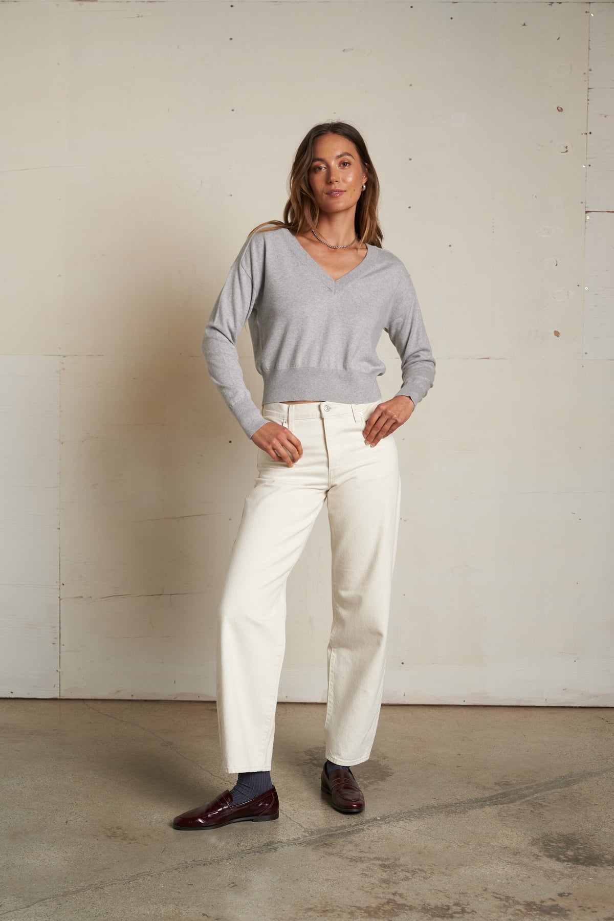 The Georgina sweater is crafted from a blend of 95% cotton and 5% cashmere. Designed with a v-neckline, long sleeves, and a banded bottom, it’s a timeless silhouette with elevated softness. Gentle machine wash cold. do not bleach. tumble dry low. warm iron if needed. do not spot treat, or add softener.