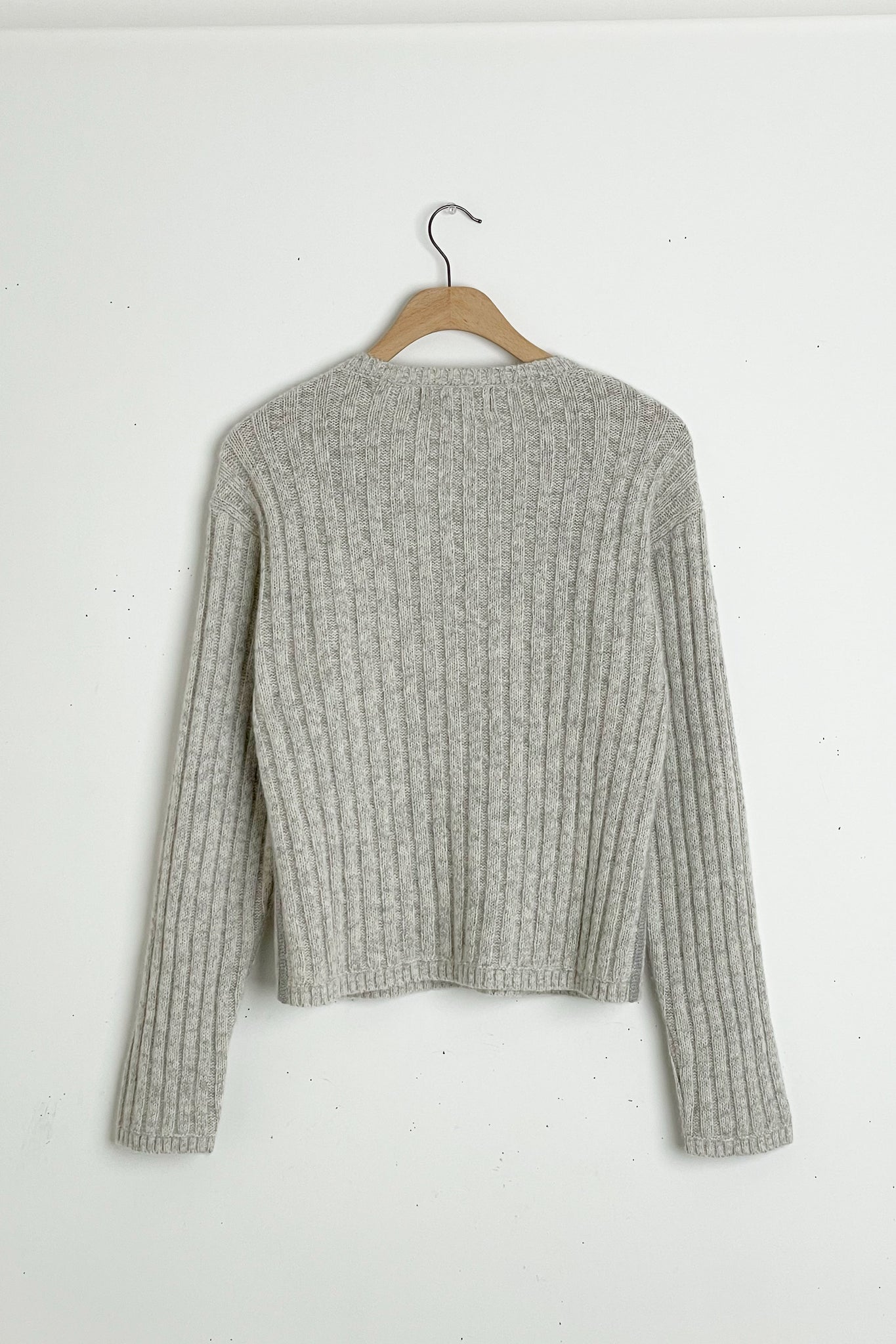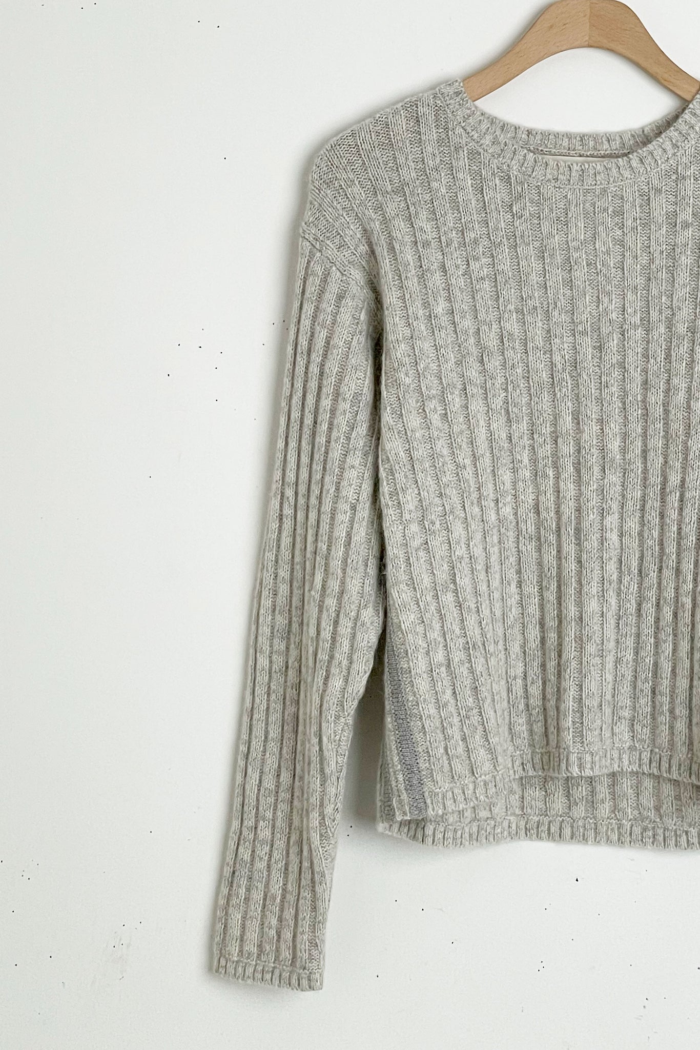 Cozy sweater with a relaxed fit and a unique ribbing pattern. With contrast knitting on the side in a darker grey. 53% Cotton, 28% Baby Alpaca, 10% Recycled Polyamide, 9% Wool. Dry clean only.