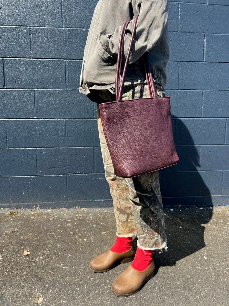 The perfect everyday shoulder bag, sized to be a daily staple with space for almost anything. Has a roomy interior with an open leather pocket, a brass key clip, and a concealed magnetic closure. The leather exterior extends to the base and straps, and has a cotton/linen interior with an open leather pocket and clip. Measures 9"W x 10"T x 3.5" D.