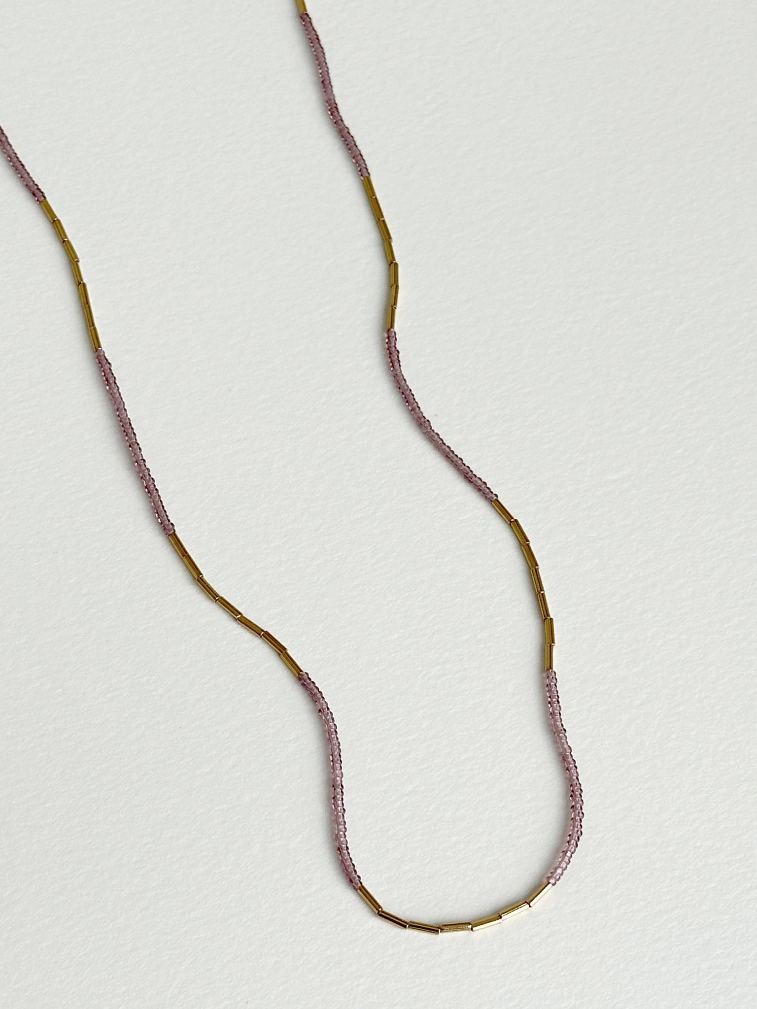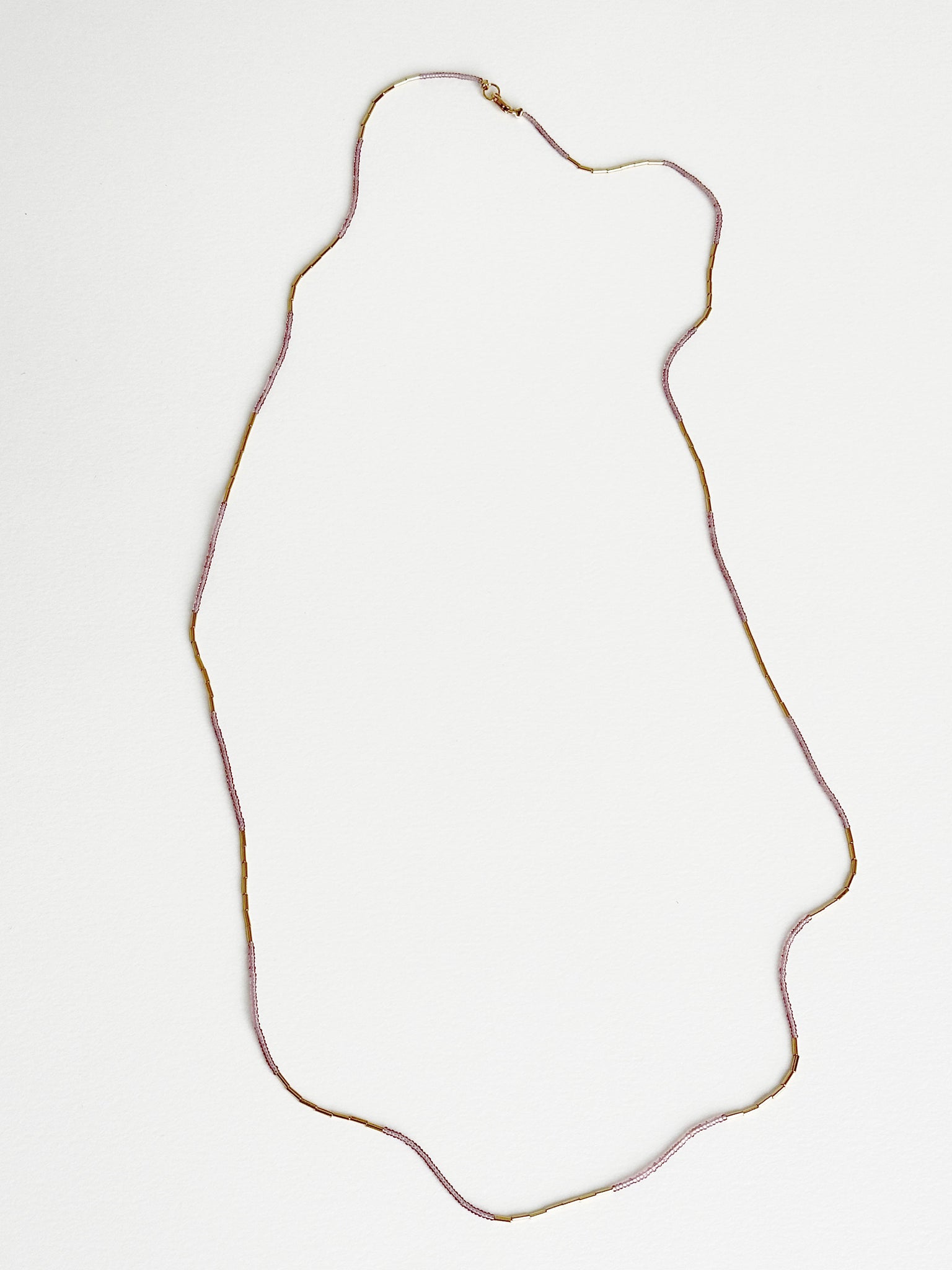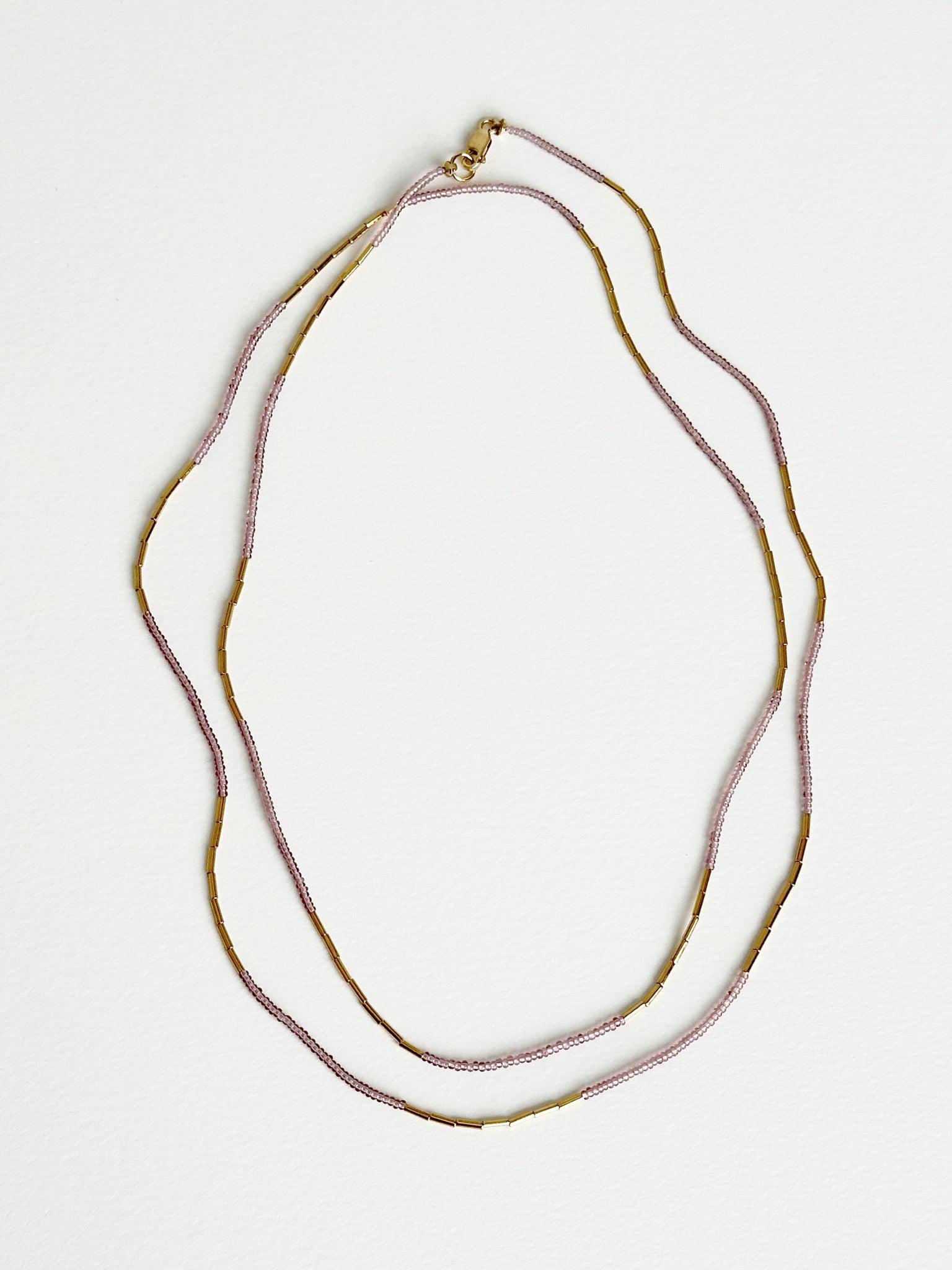 Long Gold Fill Necklace/Bracelet Pink. Beautiful subtle shimmer in pale pink seeds and gold filled clasp. Measures 32"