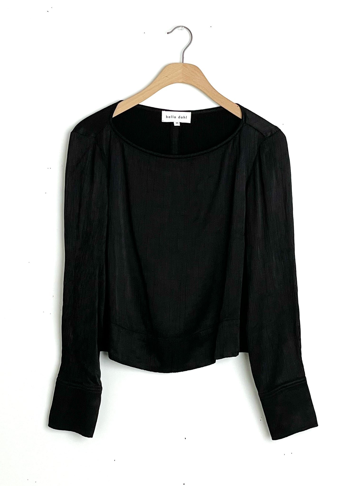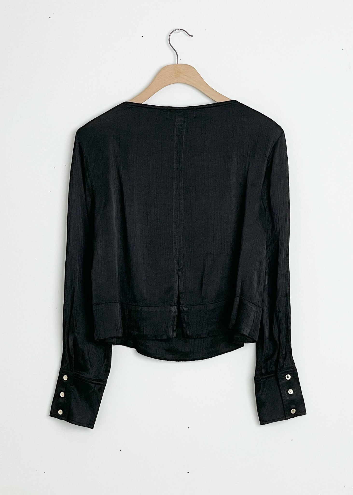 Long sleeve blouse with a subtle boat neckline in a pleated fabric. With a split hem in the back and metallic buttons on the cuff. Slightly cropped. Fits true to size. 57% Rayon, 43% Viscose. Machine wash cold, tumble dry low.