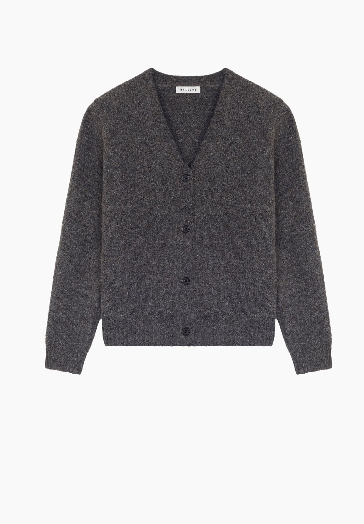 Clean finish edge V neck cardigan. Designed and manufactured in Galicia, Spain. Soft knit fabric.  Regular fit, standard length. Composition 30% Cotton 25% Extra-fine Merino Wool 25% Baby Alpaca 19% Polyamide . Dry Clean Only. In a pretty soft warm shade of grey.