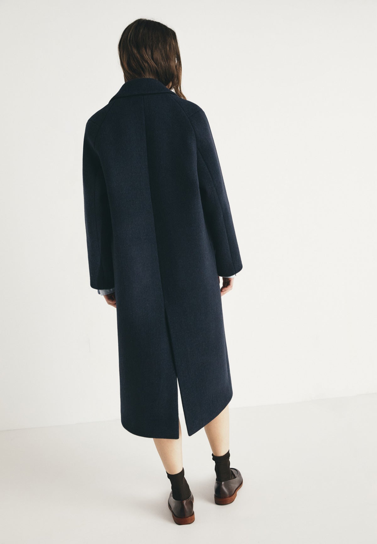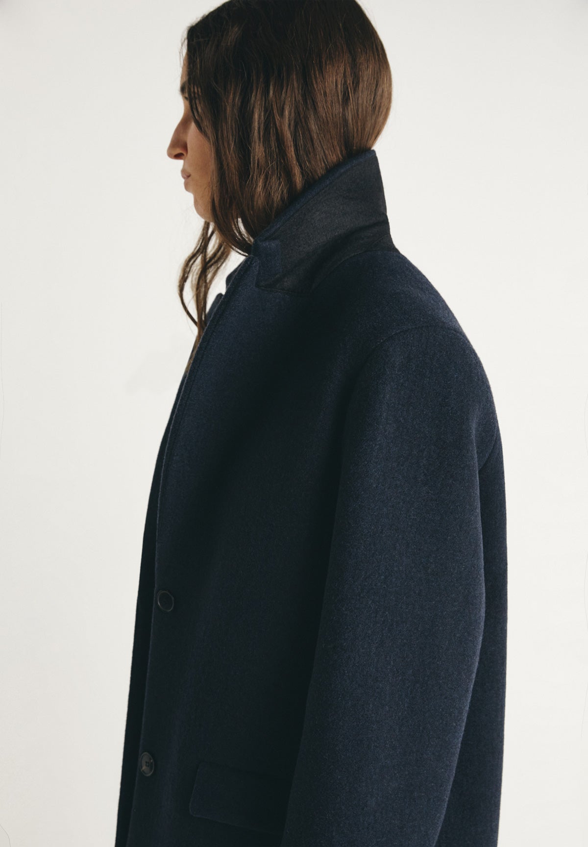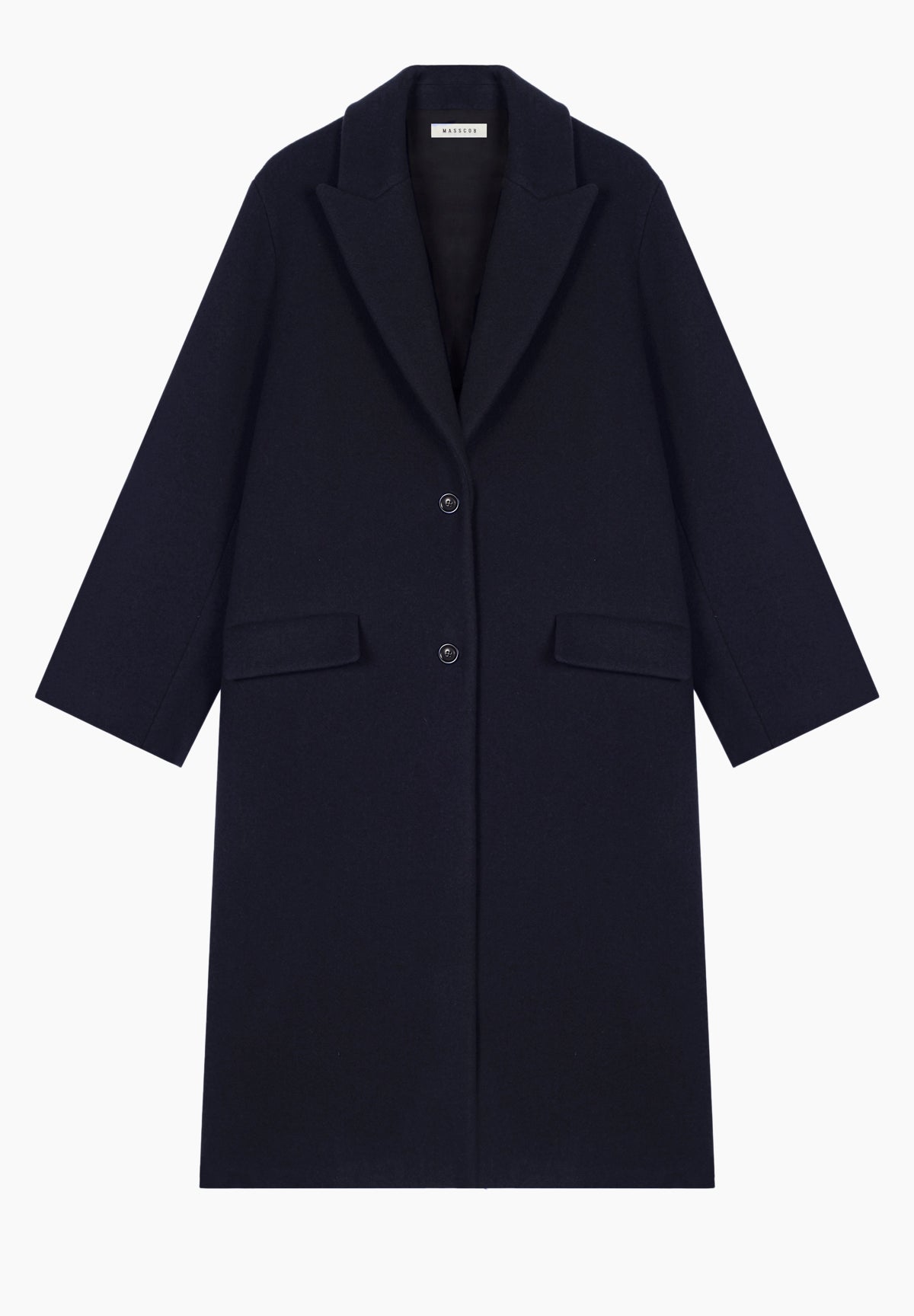 Beautifully simple long coat. Lapel collar, single-breasted, embroidered front pockets. Regular fit, elongated silhouette. Mid-weight .Fits true to size. Composition 67% Virgin Wool 33% Polyamide. Dry Clean Only. Made in Galicia Spain
