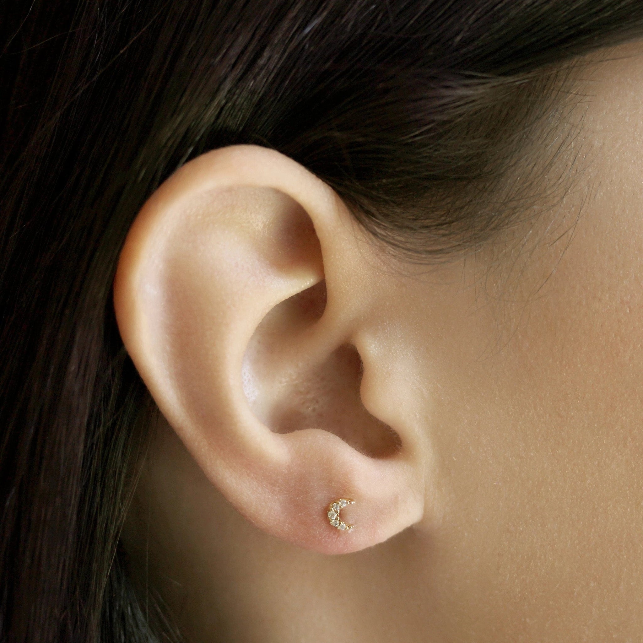 Mini pave CZ moon studs in gold over brass. Easy for everyday wear & an excellent gift!