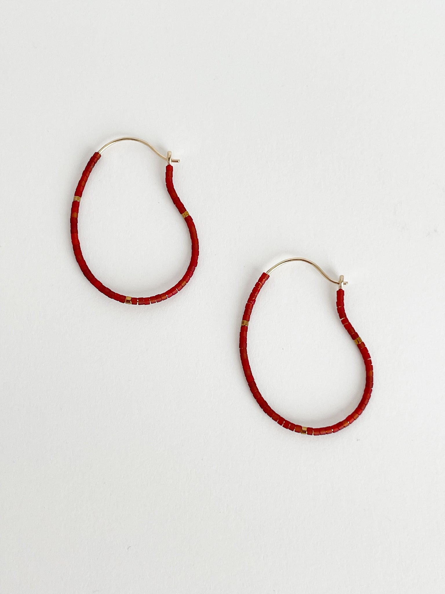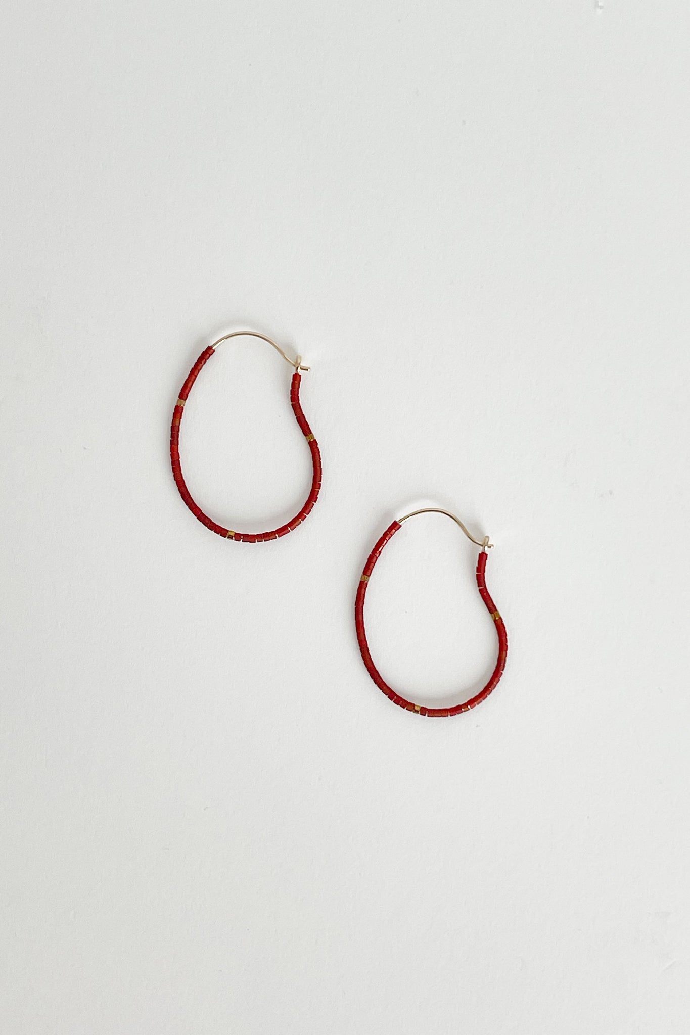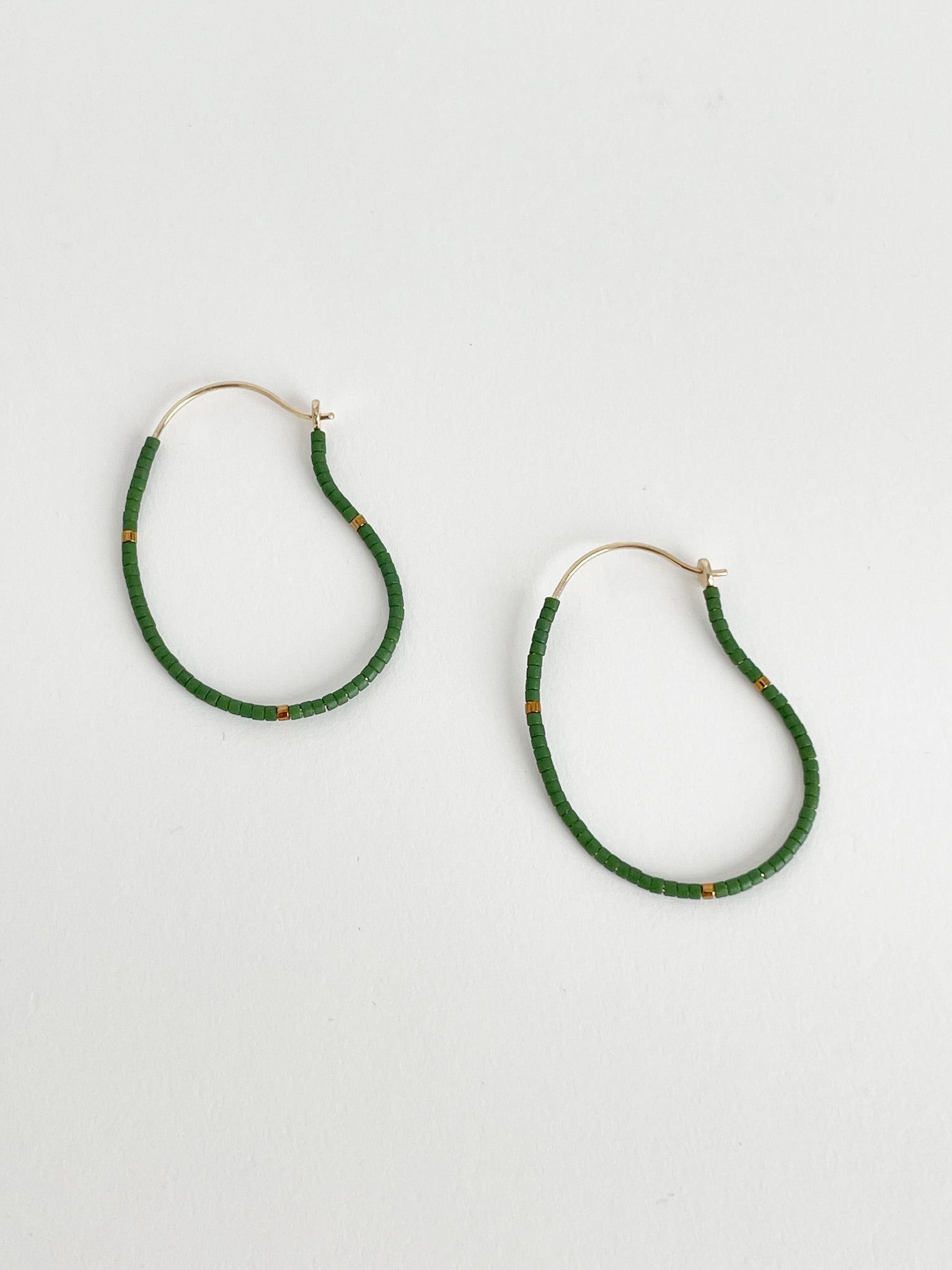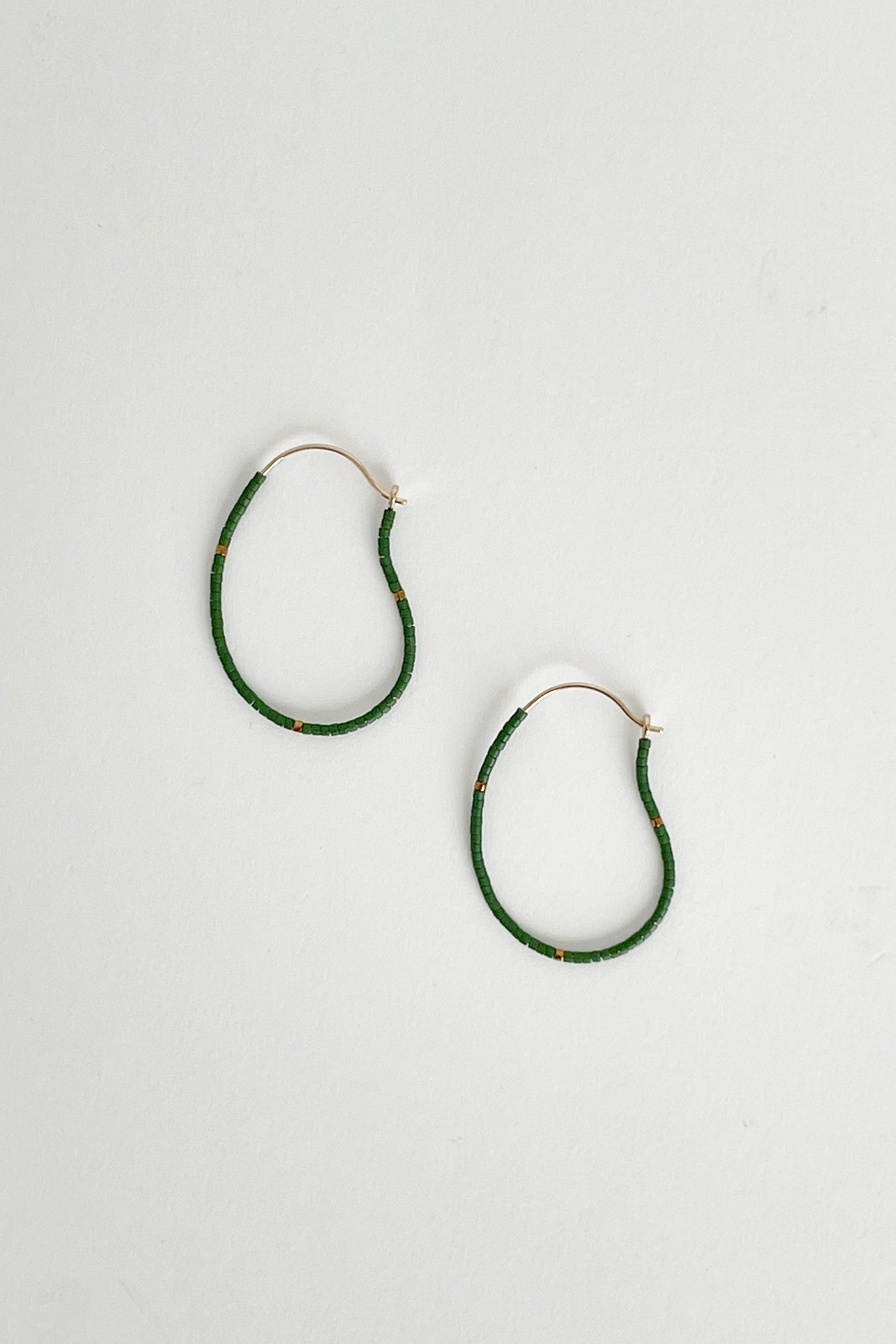 Gold plated organic-shaped hoops threaded with Miyuki glass beads.  The beads are made from a mouthblown glass tube cut into thin slices to make individual beads. 18K gold plated brass. Hoop 40 mm x 20.5 mm | Wire width 0.8 mm | Miyuki 1.3 mm.