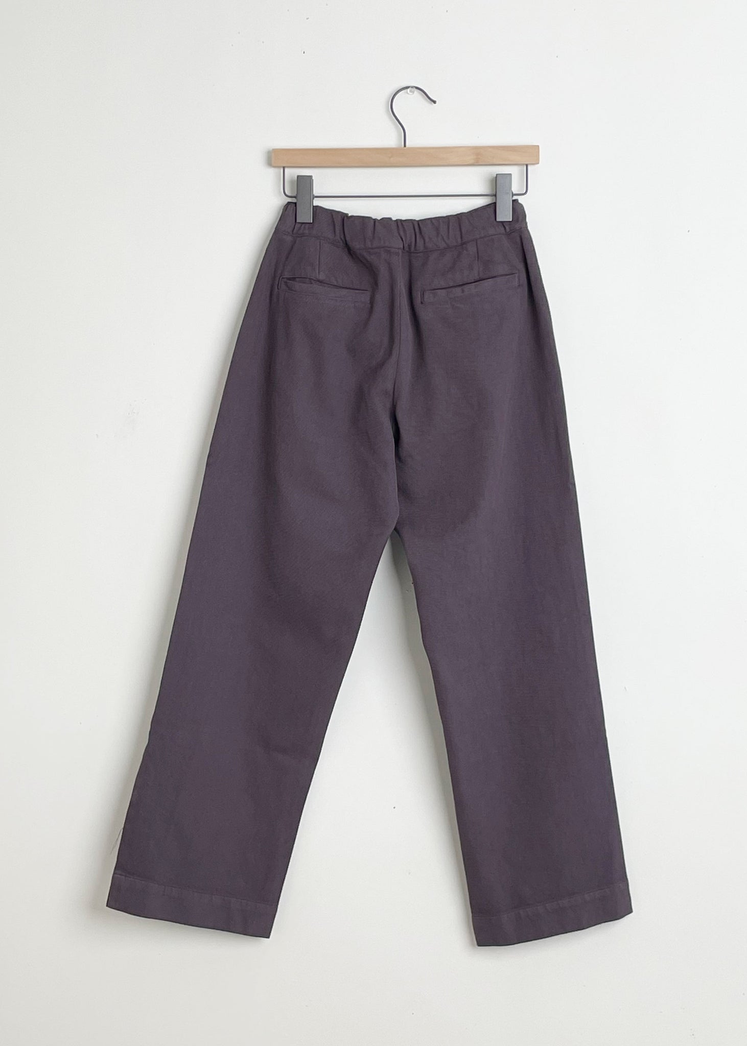 Cotton twill high waisted, wide-leg trouser with elastic waist at the back. Side slit pockets. 100% Cotton. Machine wash cold and hang dry. Made in Italy.