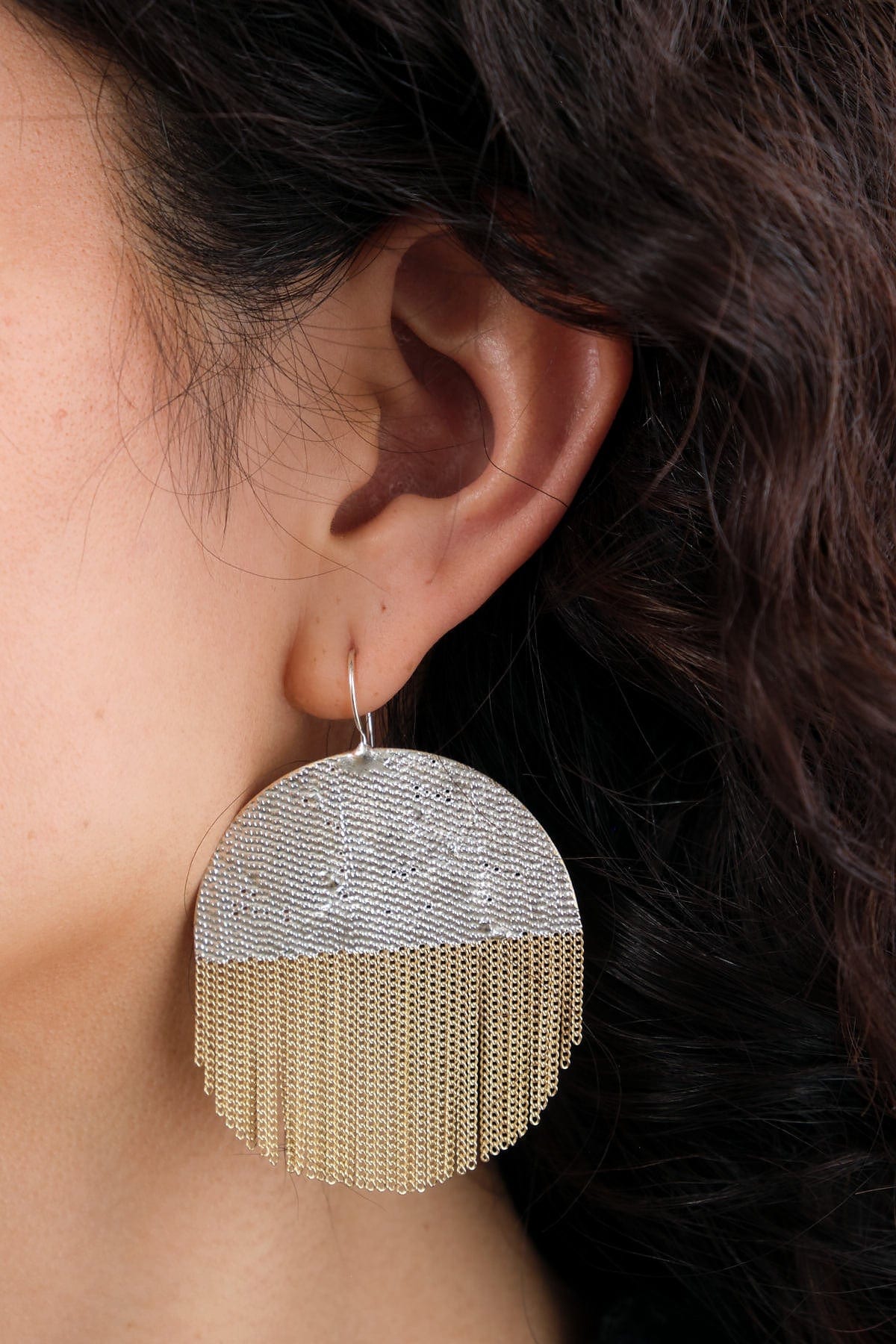 Half moon sterling silver earrings with soldered brass chain.  Material: Brass chain and silver. Made in California. Pieces may be gently cleaned by submerging for several minutes in hot apple cider vinegar and washing with soap and water.