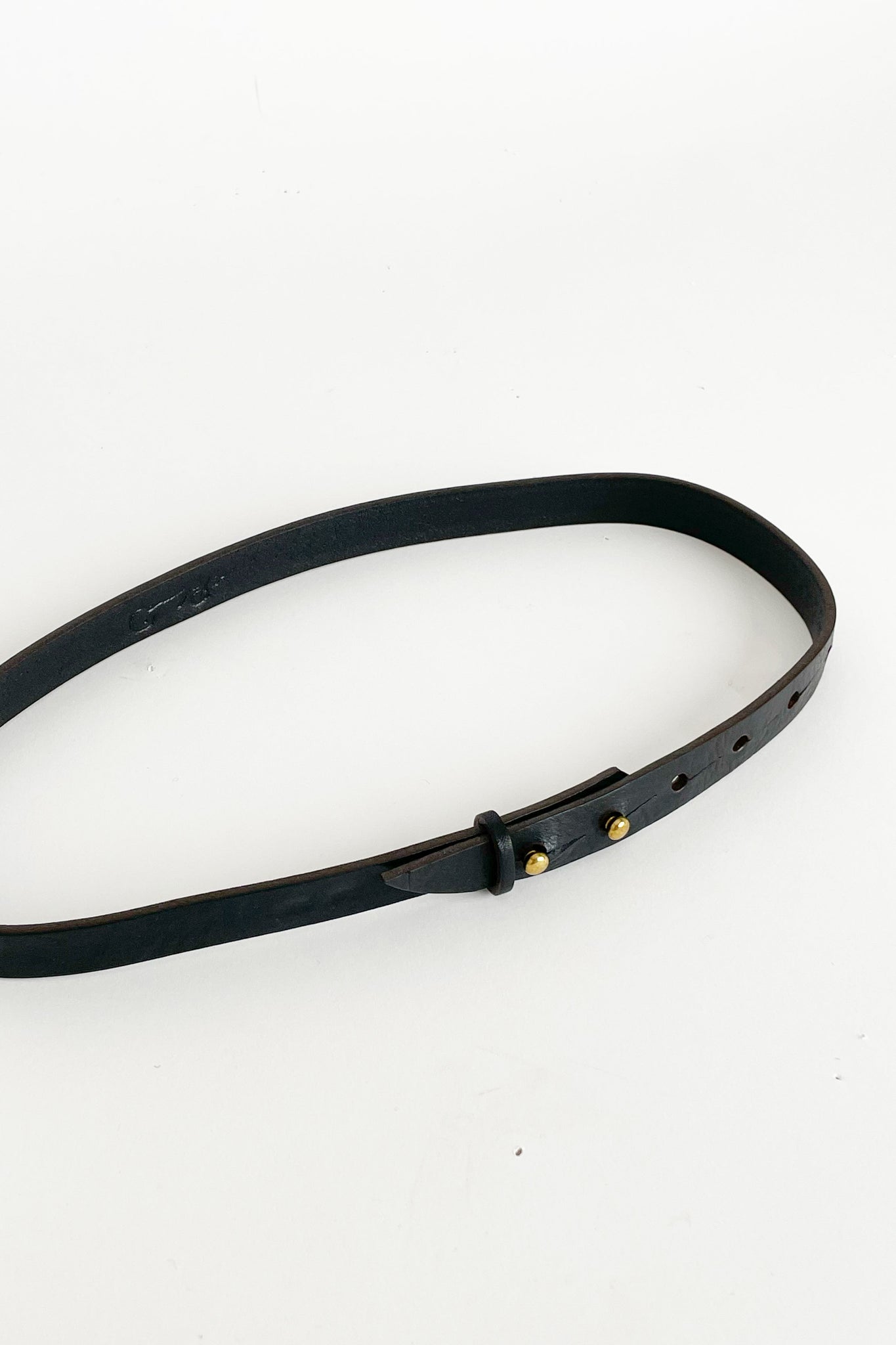 Black skinny belt with two metal studs for closure. Measures 34.25" in length on size S with a 3/4" width. Handmade in California.