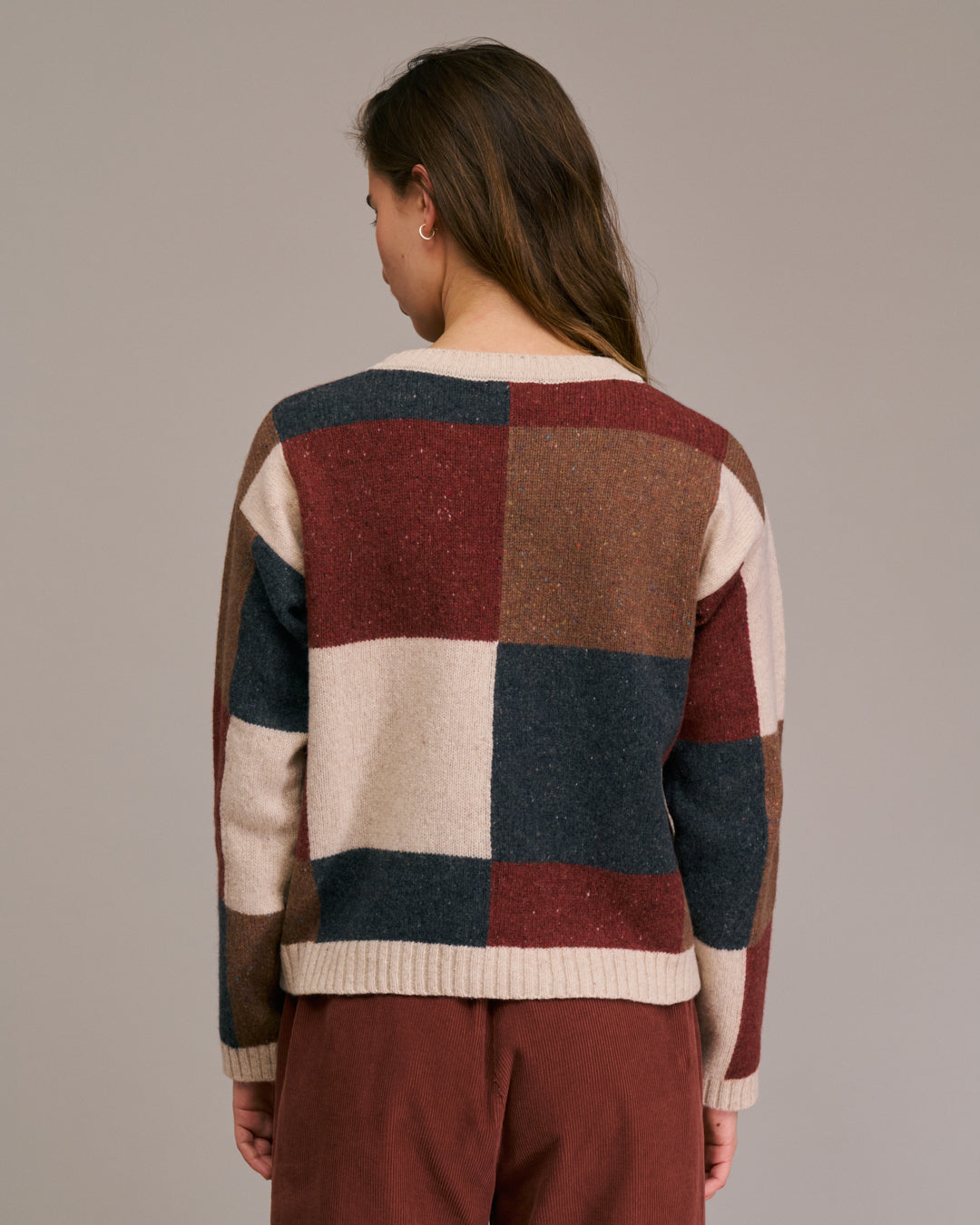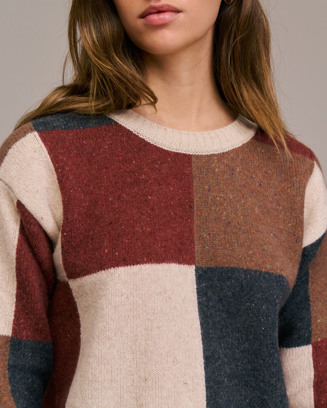 This sweater features a bold, color-block patchwork design. Crafted from a soft, textured knit, it has a cozy, relaxed fit with a classic crew neckline and ribbed detailing at the cuffs, hem, and collar. 44% Wool, 22% Recycled Wool, 28% Recycled Polyamide, 4% Polyamide, 2% Elastane. Hand wash, lay flat to dry or dry clean.