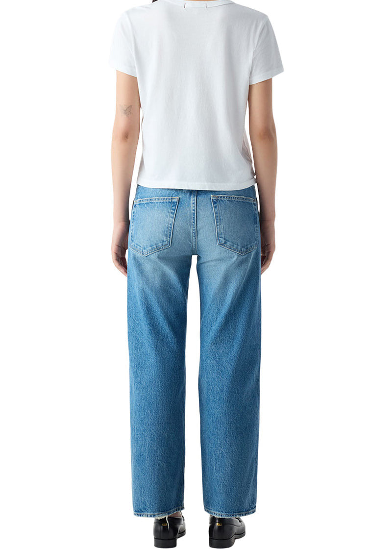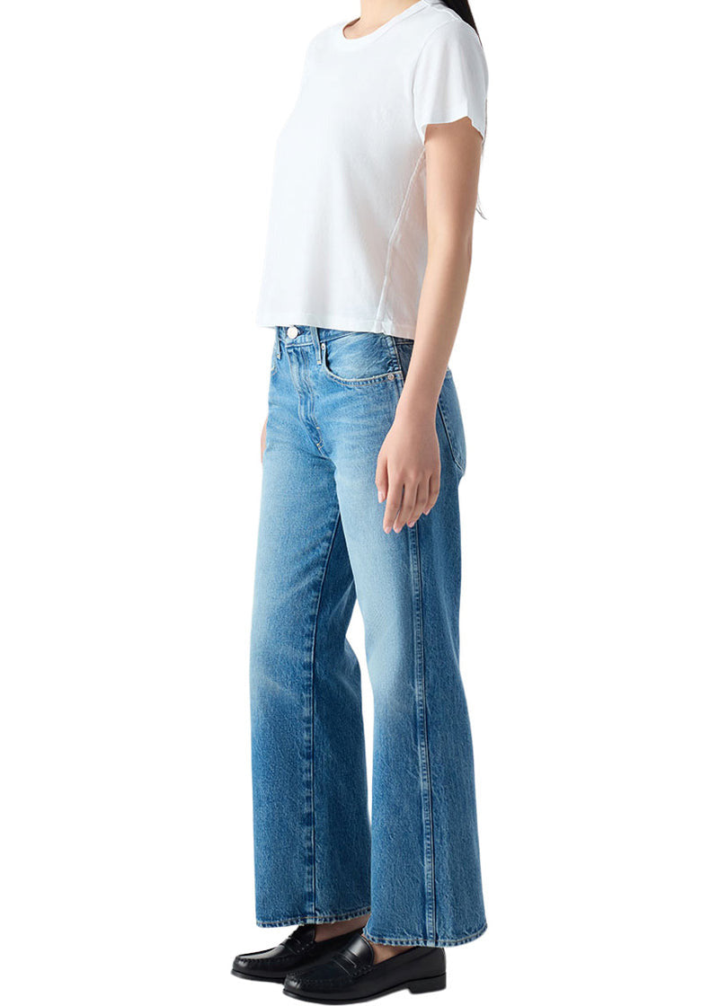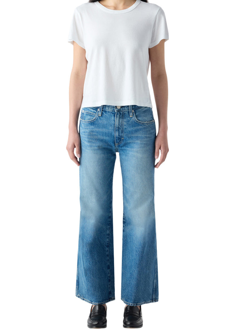 A mid rise denim with an easy flare and cropped ankle length. Pair with your favorite sweater this season! 100% Cotton. Machine wash cold, tumble dry low. Made in USA.