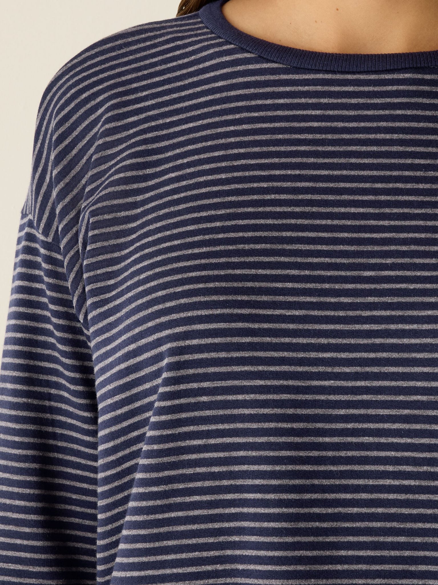 Soft and simple, the round neck box-top is as soft as a hug with a natural stretch and fleecy interior. Designed to drape around the body with a rib trim at the cuffs and hem, this top is effortlessly chic and versatile. 65% Tencel Lyocell, 28% Organic Cotton, 7% Elastane.