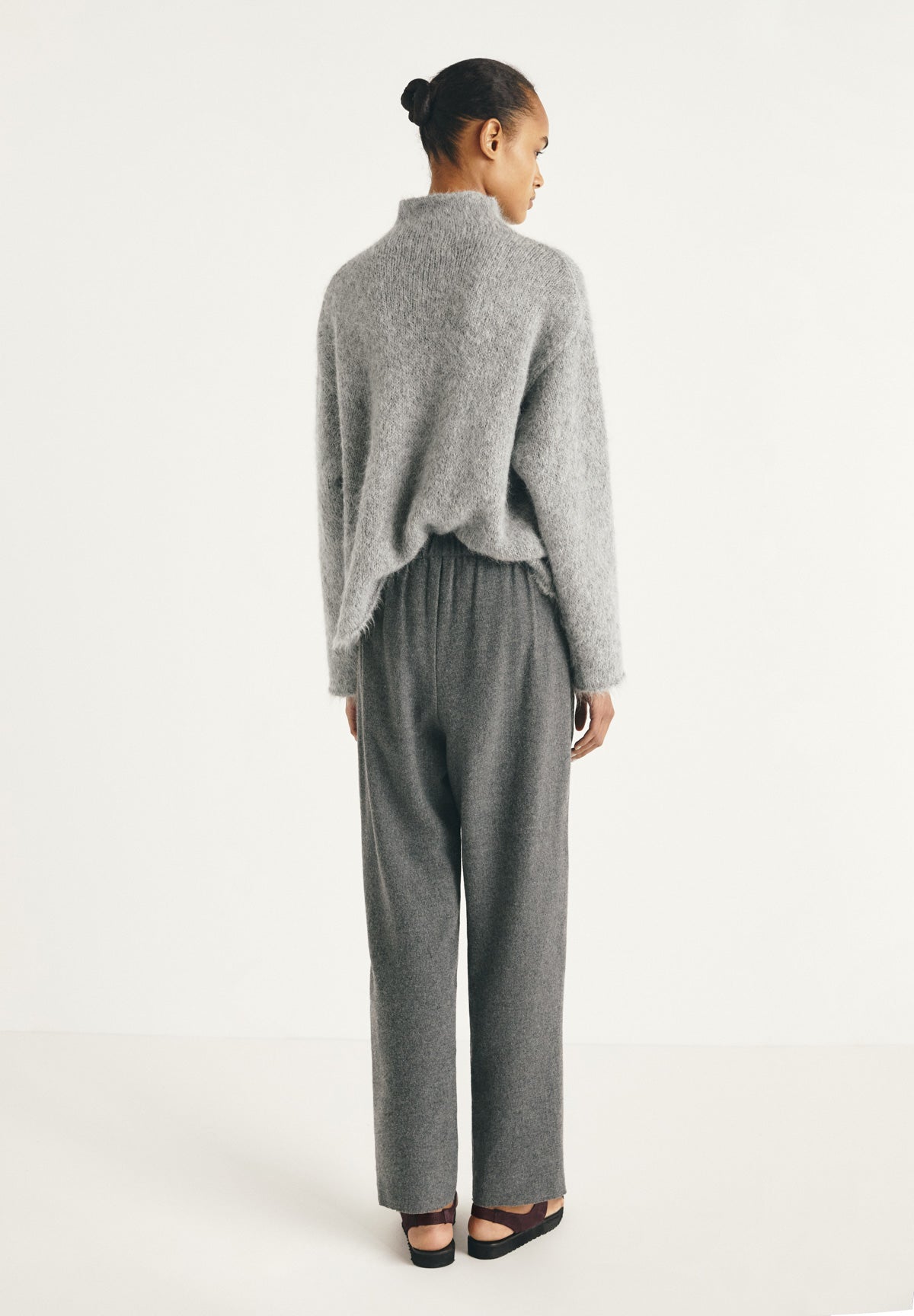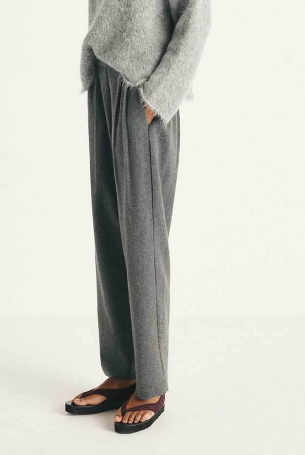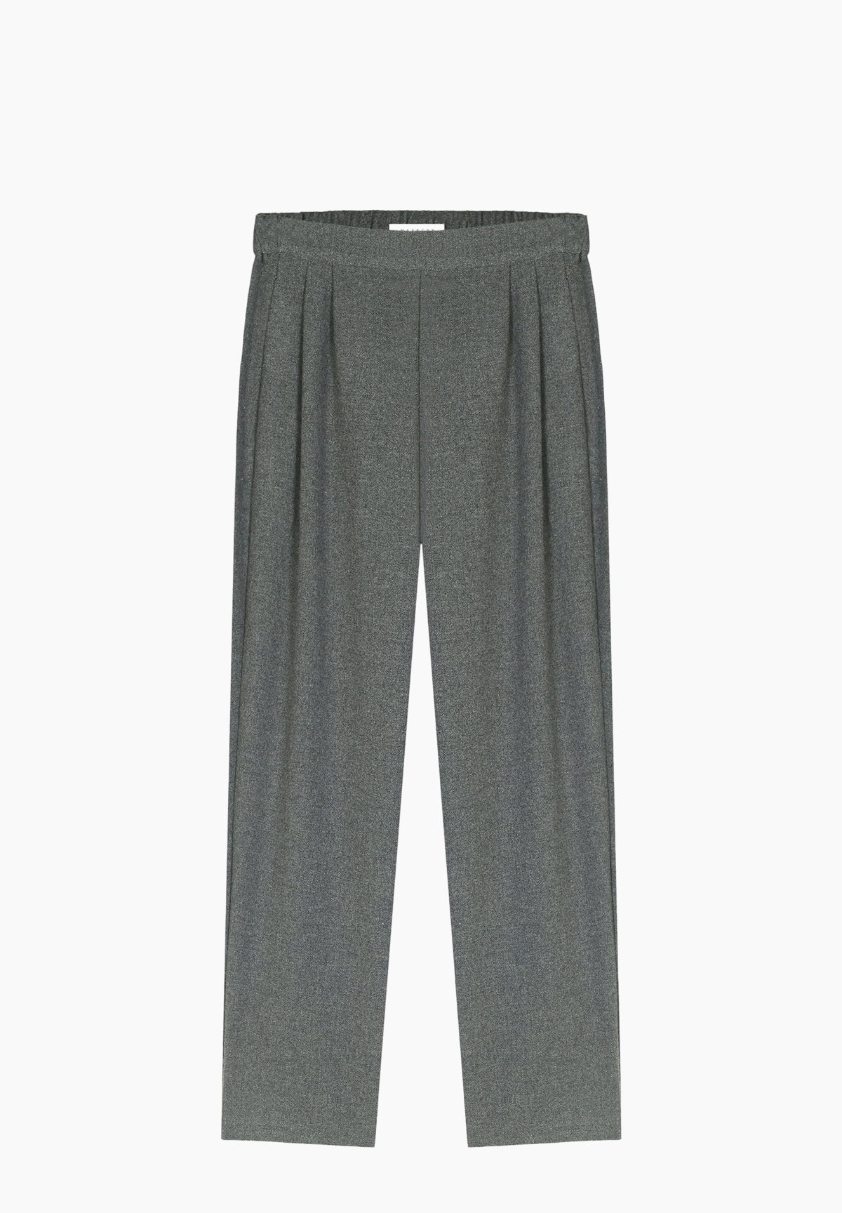 Simple light weight wool blend trousers with elasticized back detail. Designed and manufactured in Galicia, Spain.  Fixed waist at the front with an elasticated back and darts. Mid-rise, regular length. Mid-weight fabric  Composition 72% Wool 26% Polyamide 2% Other fibers . Dry Clean Only