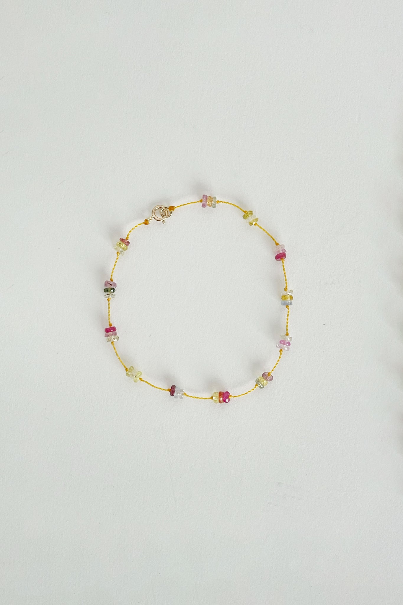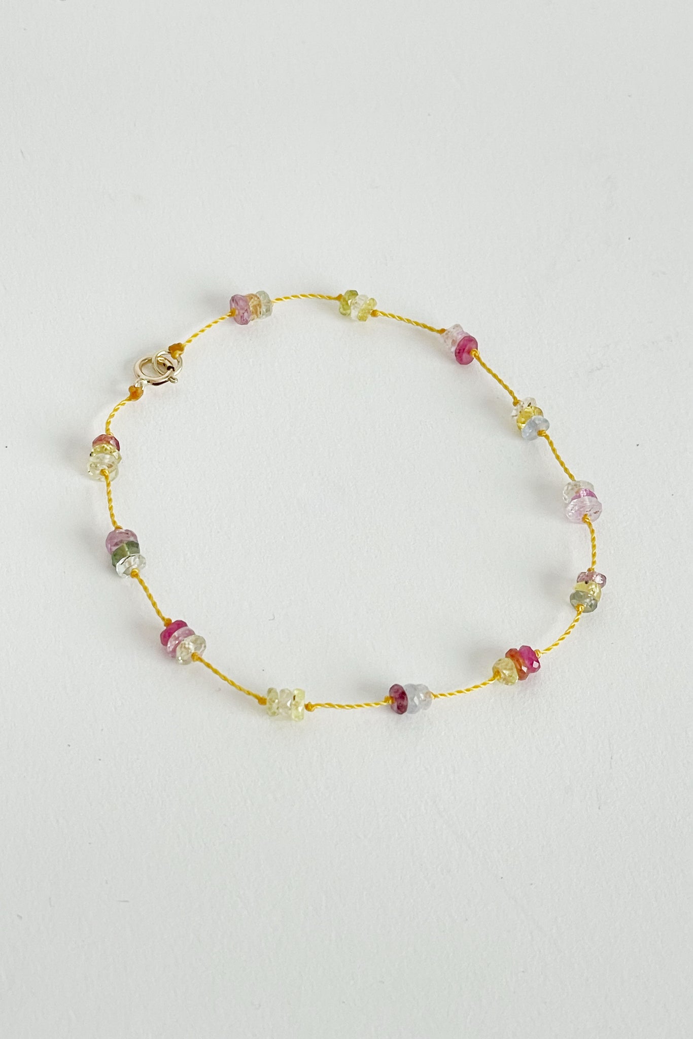 These sparkling rainbow sapphires have beautiful clarity and come in the most incredible range of colors. Beads are thoughtfully grouped into 3’s based on color composition then knotted to a durable nylon cord. Beads are about 3mm in diameter and 1mm in width. The bracelet closes with a solid 14k gold spring clasp.