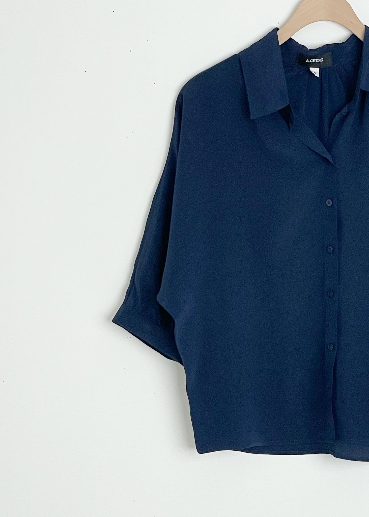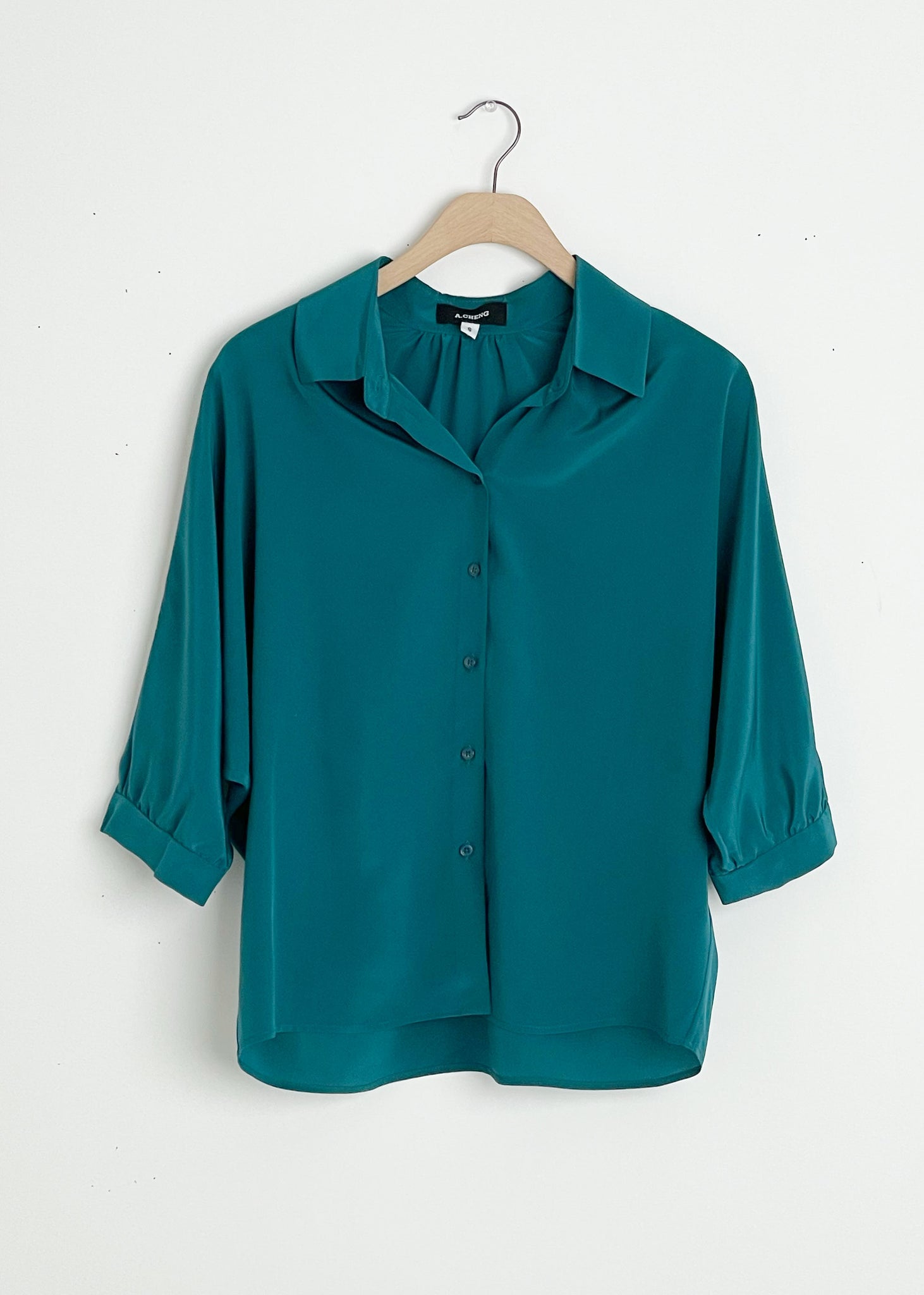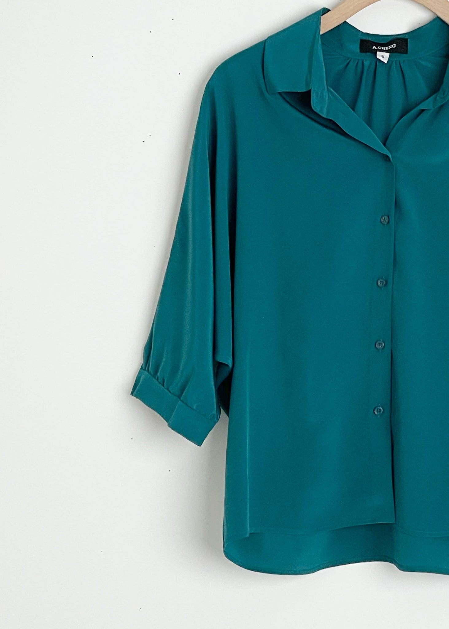 This dolman sleeve shirt is crafted from smooth, luxurious silk, offering a soft and breathable feel. The relaxed fit is complemented by dolman sleeves, creating a flowy, oversized silhouette with a structured hem that adds balance. Perfect for effortless styling. 100% Silk. Dry clean only. Made in USA. Size S: 23.5" center back length.