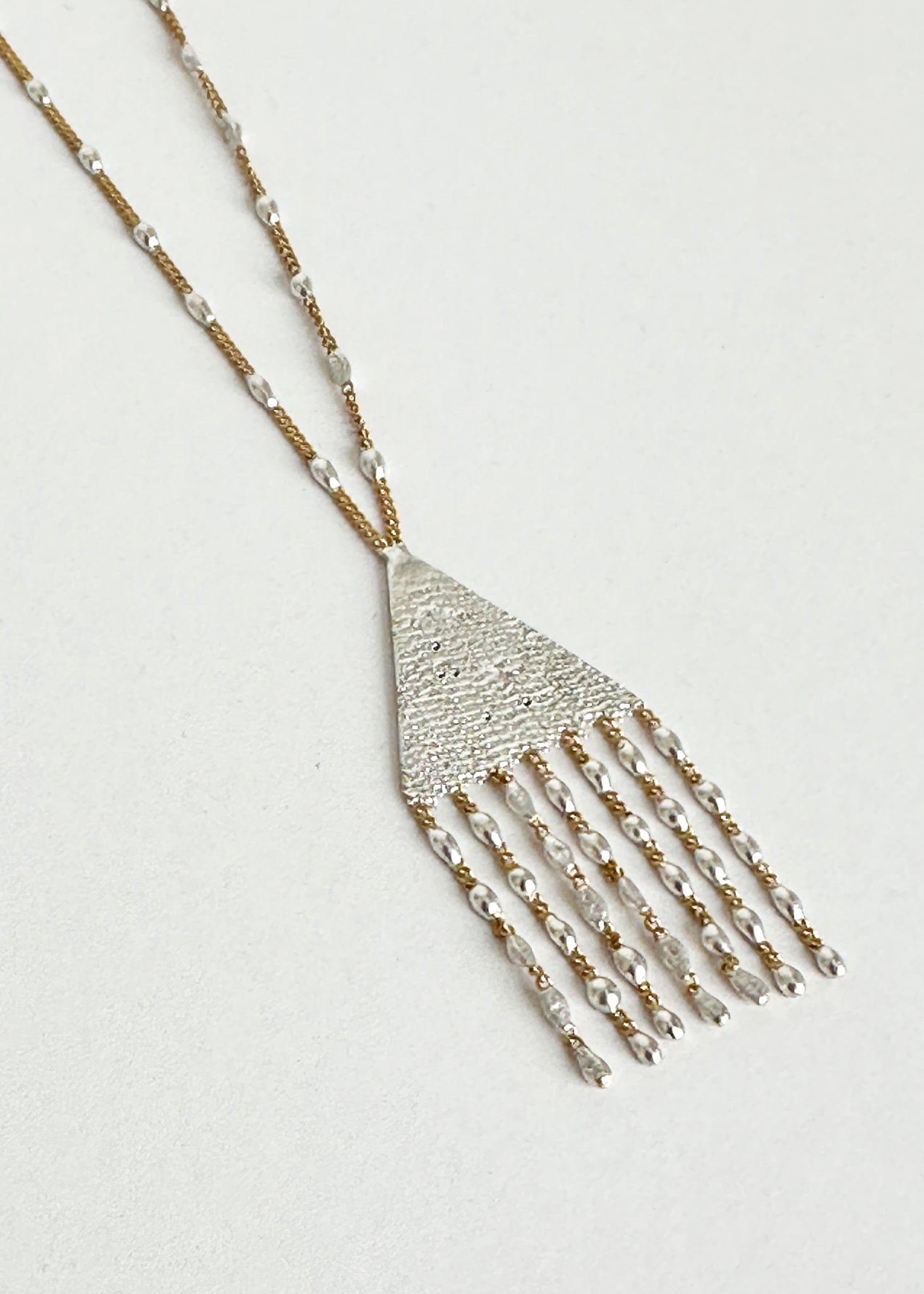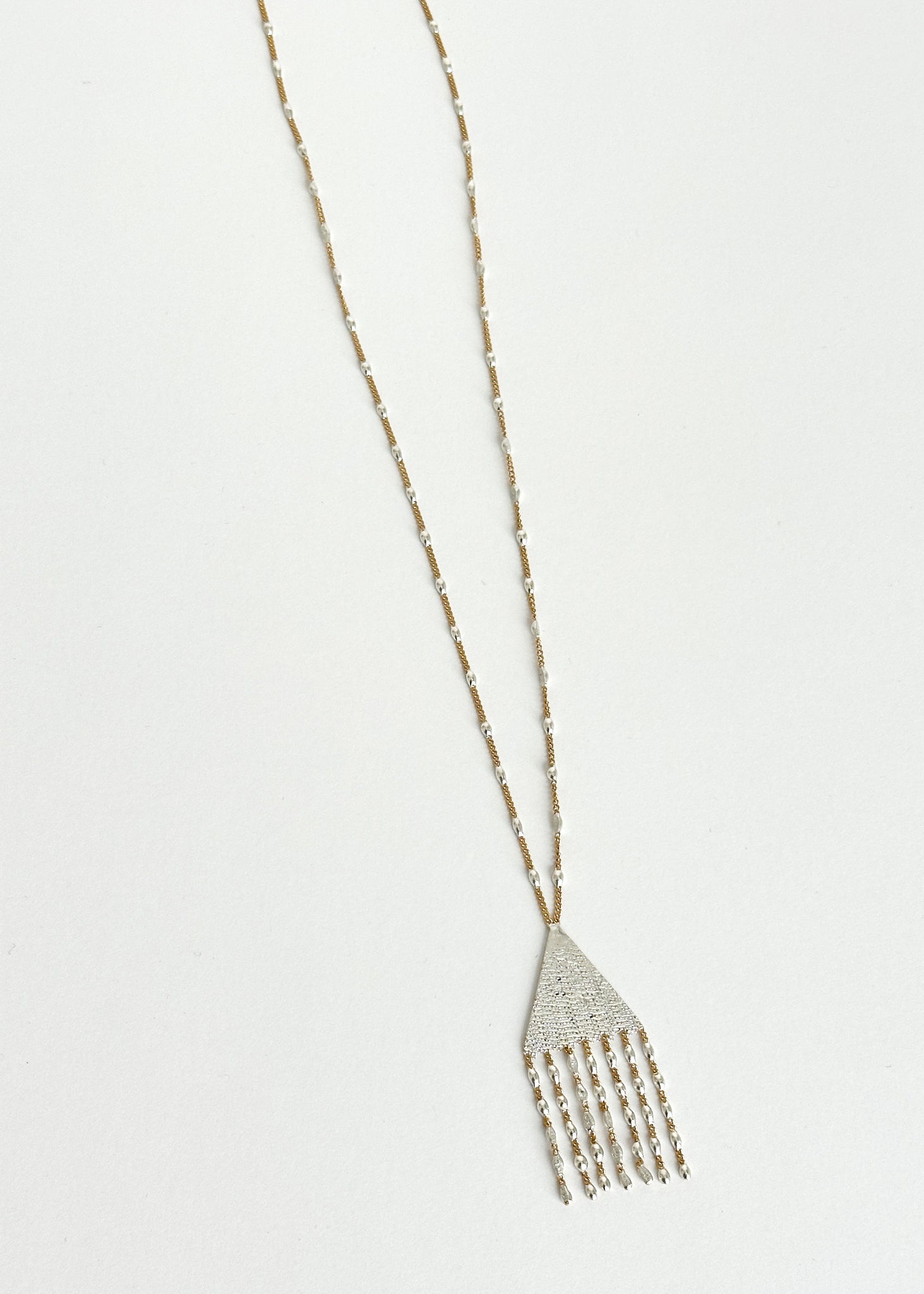 A necklace constructed of brass chain and silver solder. Approximately 24" long. Pendant itself is 1 3/4" Each piece is made by hand in Los Angeles. Silver and brass will oxidize and patina with time. This process should be celebrated as you wear and enjoy the pieces.