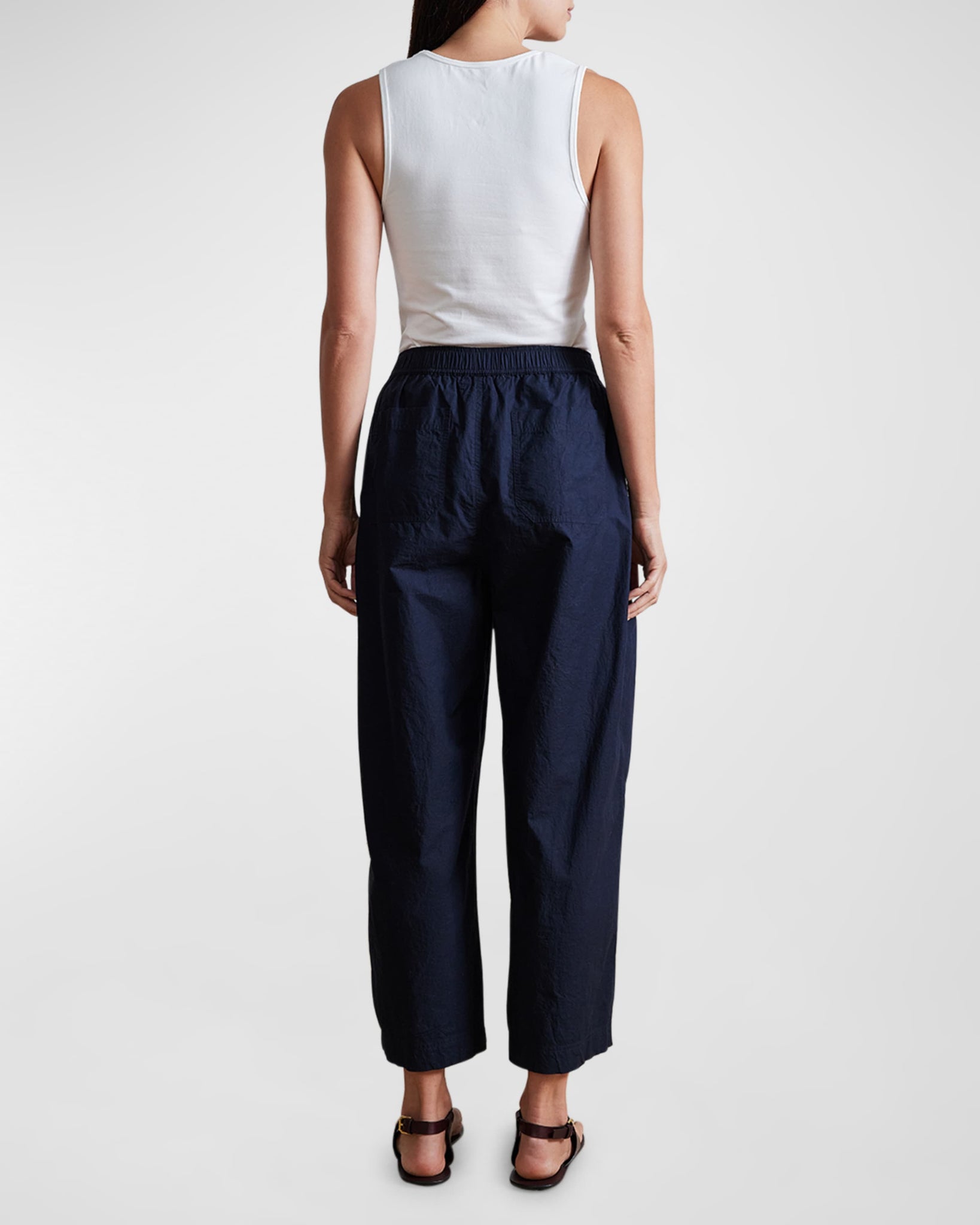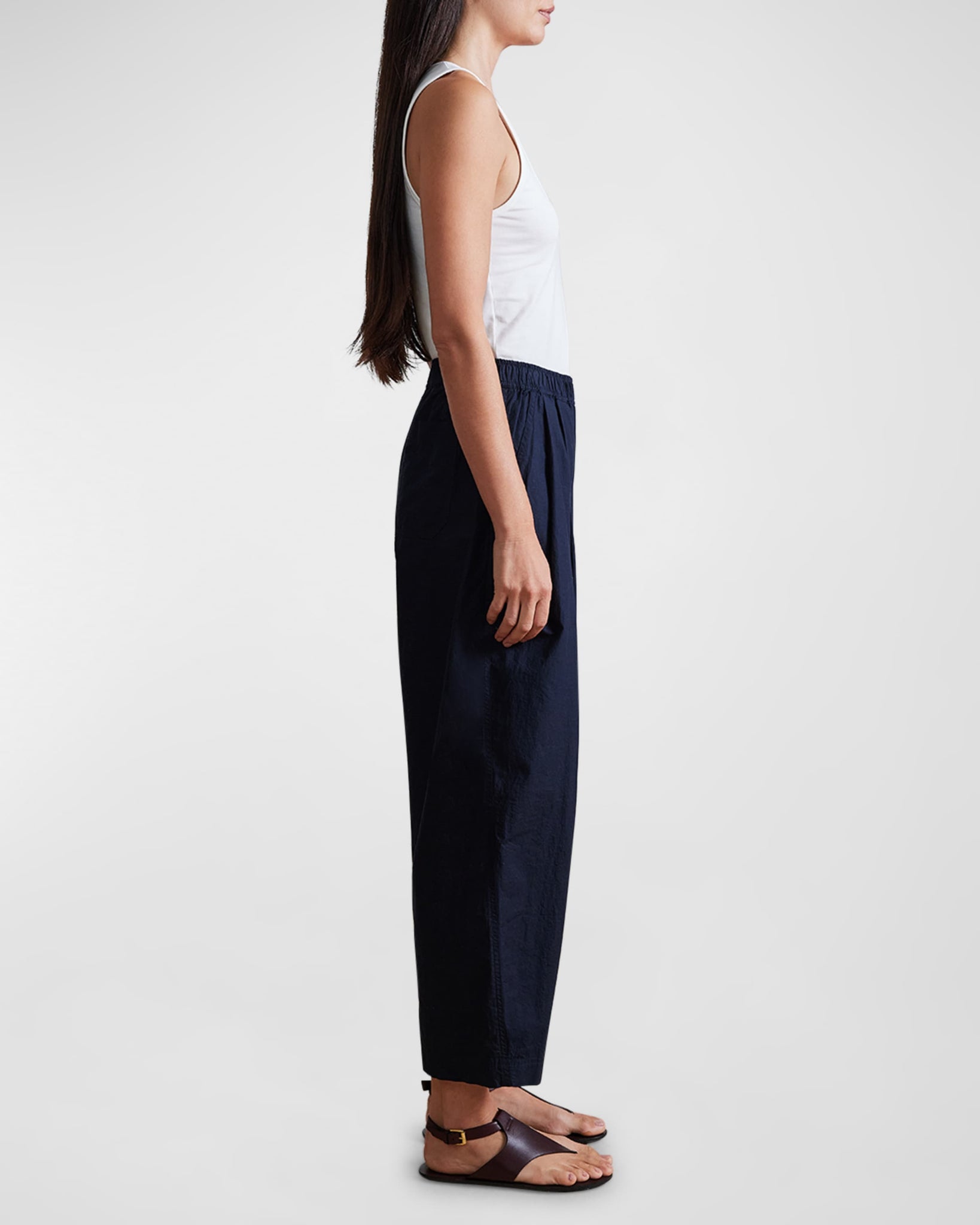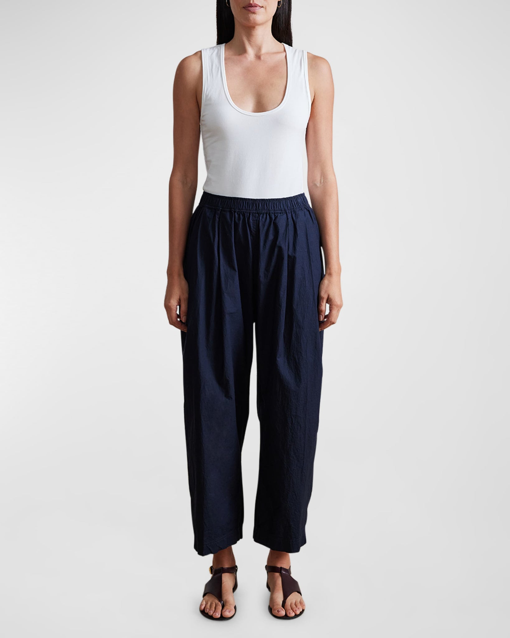 The pants you'll be reaching for everyday. Elastic waistband, front pleats, dropped crotch, barrel shape leg, front slant pockets, back patch pockets. 100% Organic Cotton Made in India. Inseam: 25"Size S front rise: 11 1/4" Machine wash cold on gentle cycle with like colors, lay flat to dry Roomy fit. Option to size down for a slimmer look.Final Sale