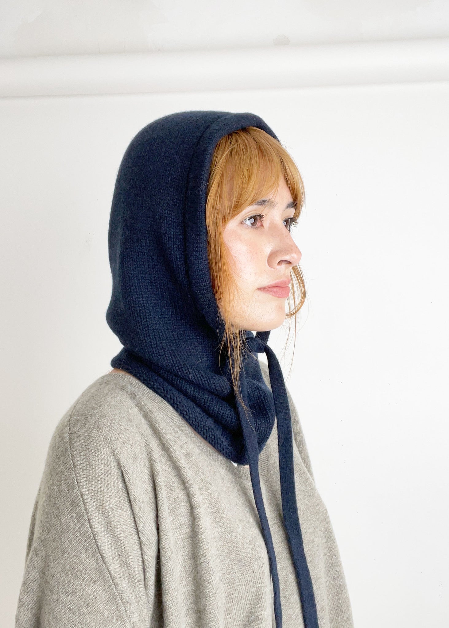 A cozy balaclava with a drawstring, made in a 100% jersey knit cashmere. Hand wash, lay flat to dry.