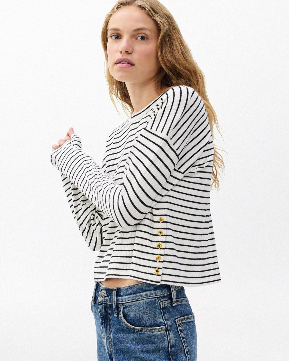 This relaxed, long-sleeve t-shirt is rib-knit from two types of lightweight, super-soft stretch yarn. Featuring button placket side details, this effortless pullover style pairs as perfectly with jeans as it does with a pair of suiting trousers. Machine wash.