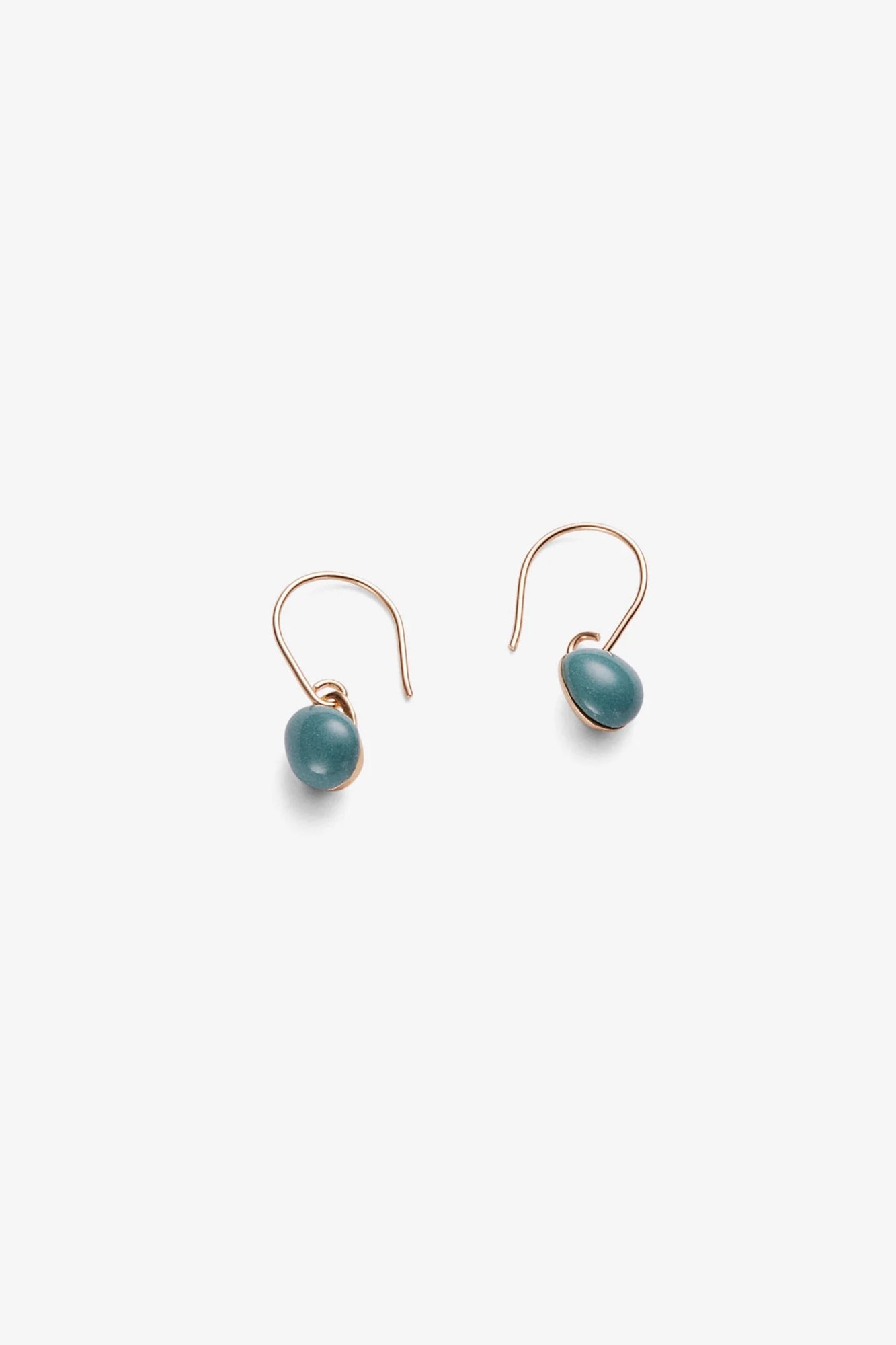 Warm ceramic eggs, handmade and paired with gold plated bases. Smooth and tactile, with natural variations that make each piece unique. Details : Gold plate: Brass allows for bigger and lighter pieces which are dipped into 18-carat gold, with a 2-micron thickness, for the desired golden feeling. Ceramic: All the ceramic pieces are designed by Helena and hand made by a local ceramicist. The glaze is hand applied, accounting for individual, tiny differences that enrich the pieces. Dimensions Length 20 mm | Ceramic 6 mm x 8 mm
