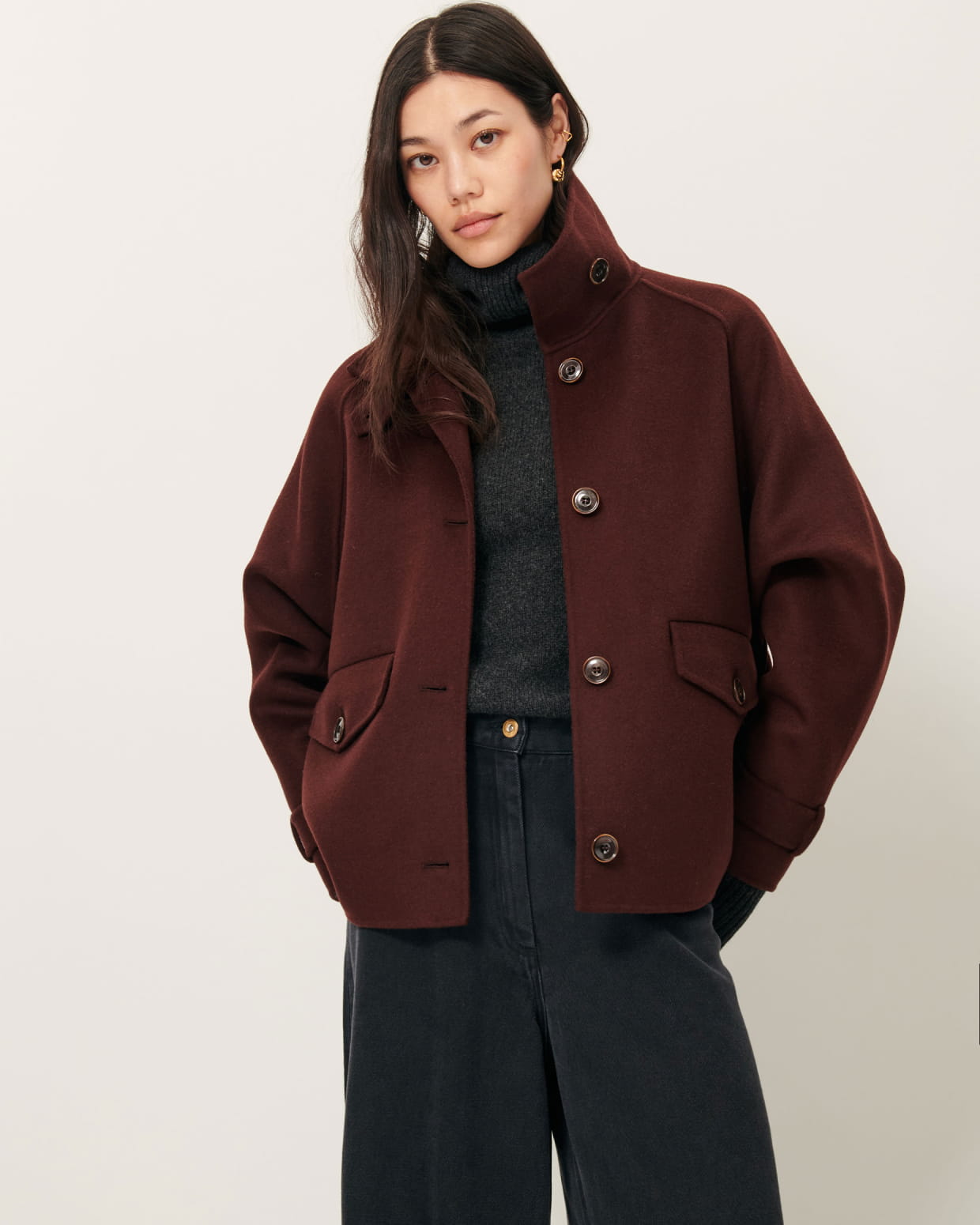 Short unlined blouson-style wool coat in a velvet-finish double weave fabric. Featuring welt pockets with button flaps at the front, raglan sleeves, and an adjustable button tab on the cuffs and sides. 80% Wool 20% Polyamide. Dry clean only.