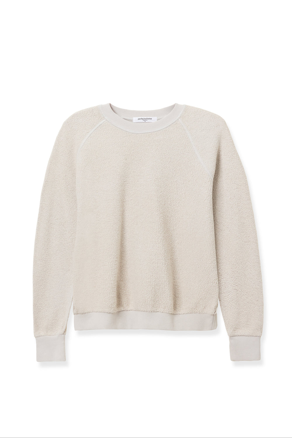 Versatile and easy to pair with anything in your closet, this slightly shrunken sweatshirt is an inside out cotton fleece with exposed raglan seaming. 100% Cotton. Machine wash cold, lay flat to dry.
